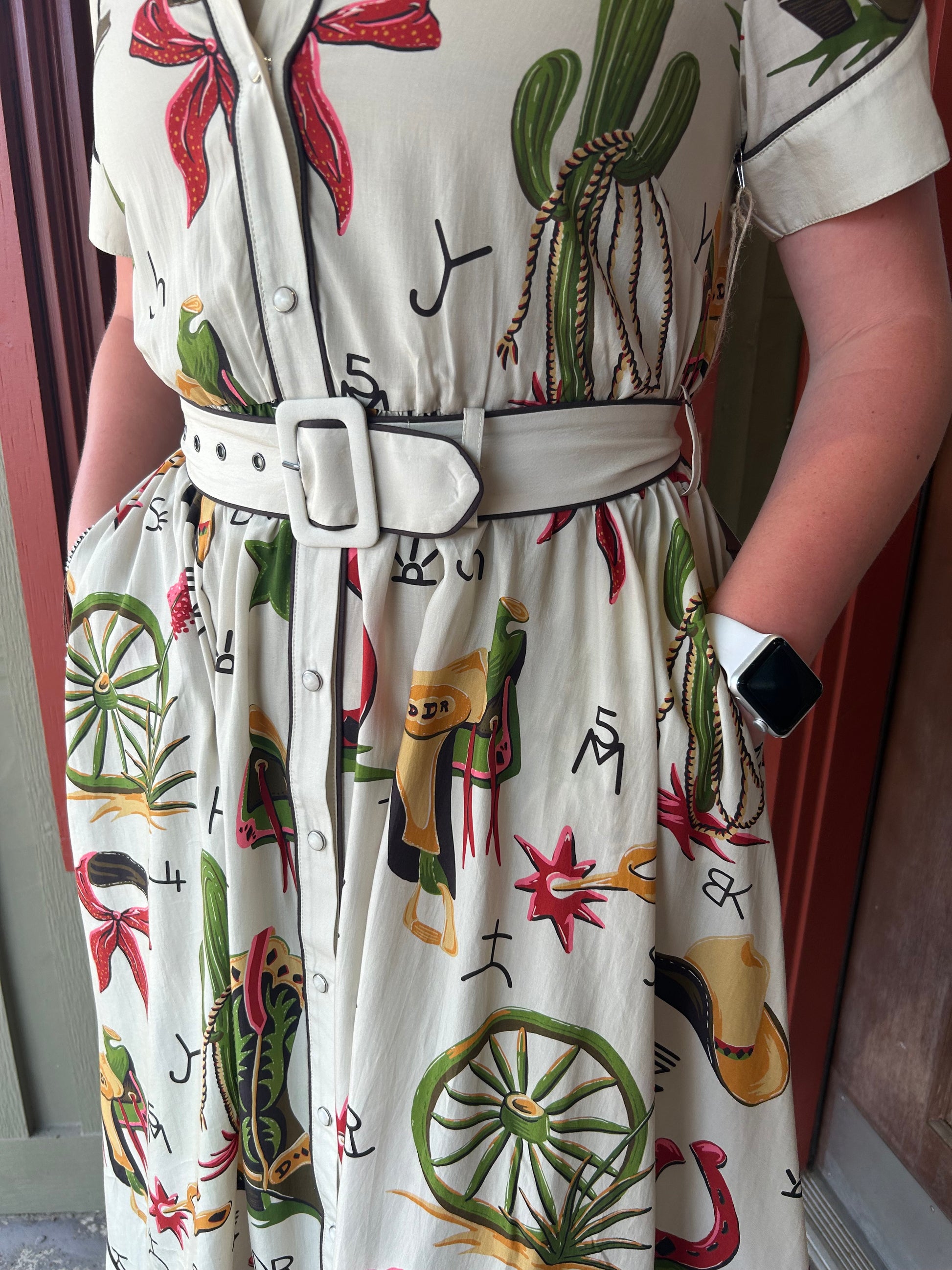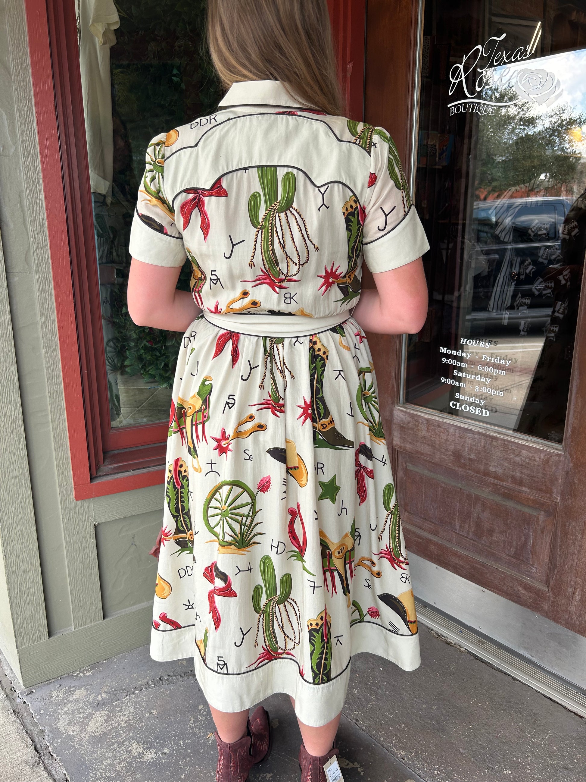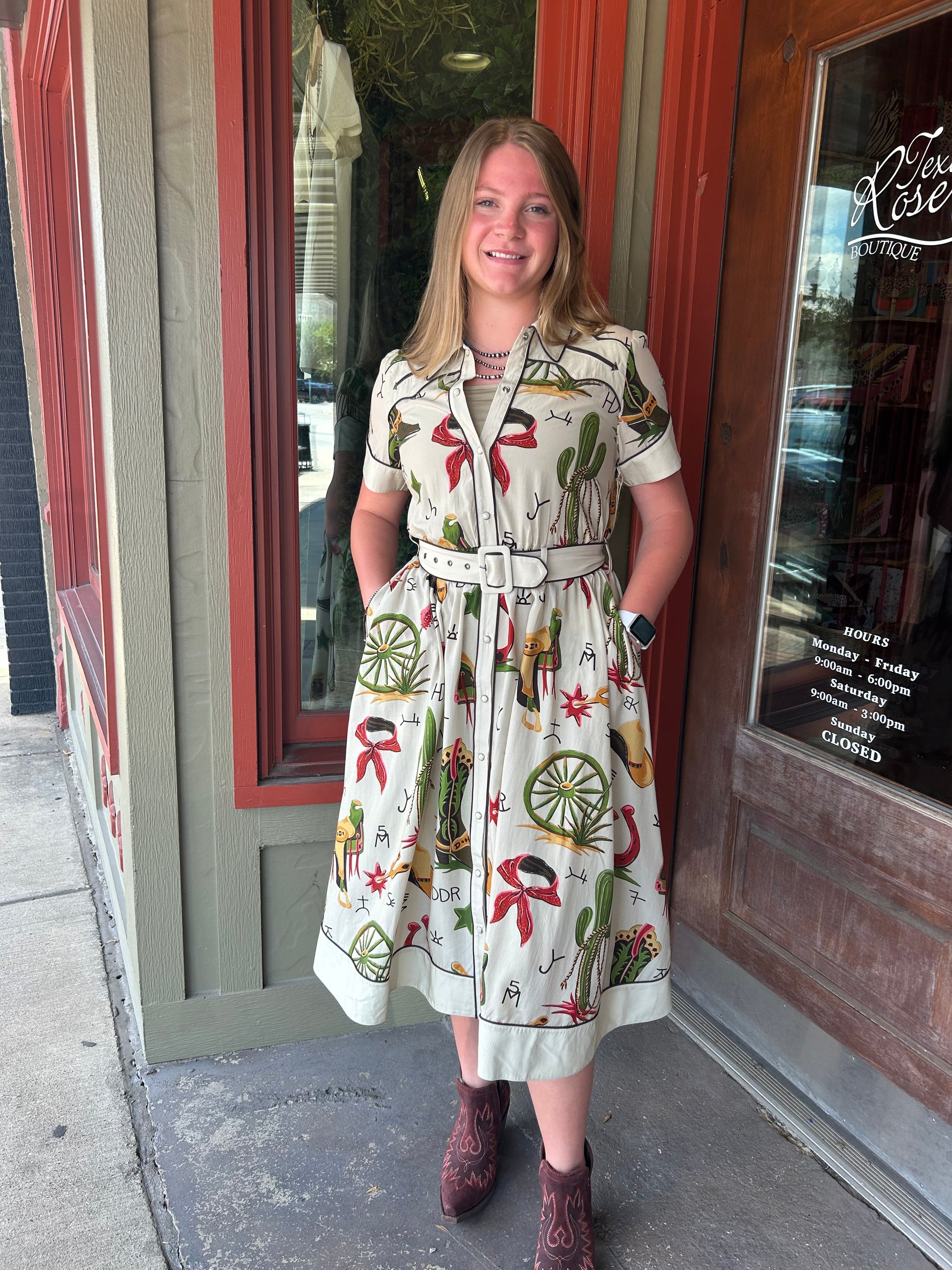 Unleash your inner fashionista with the Atomic Ranch Dress! This adorable dress is sure to turn heads with its unique design and playful style. Perfect for any occasion, it's a must-have for those who love to stand out and have fun with their fashion choices. Don't miss out on this one-of-a-kind dress!