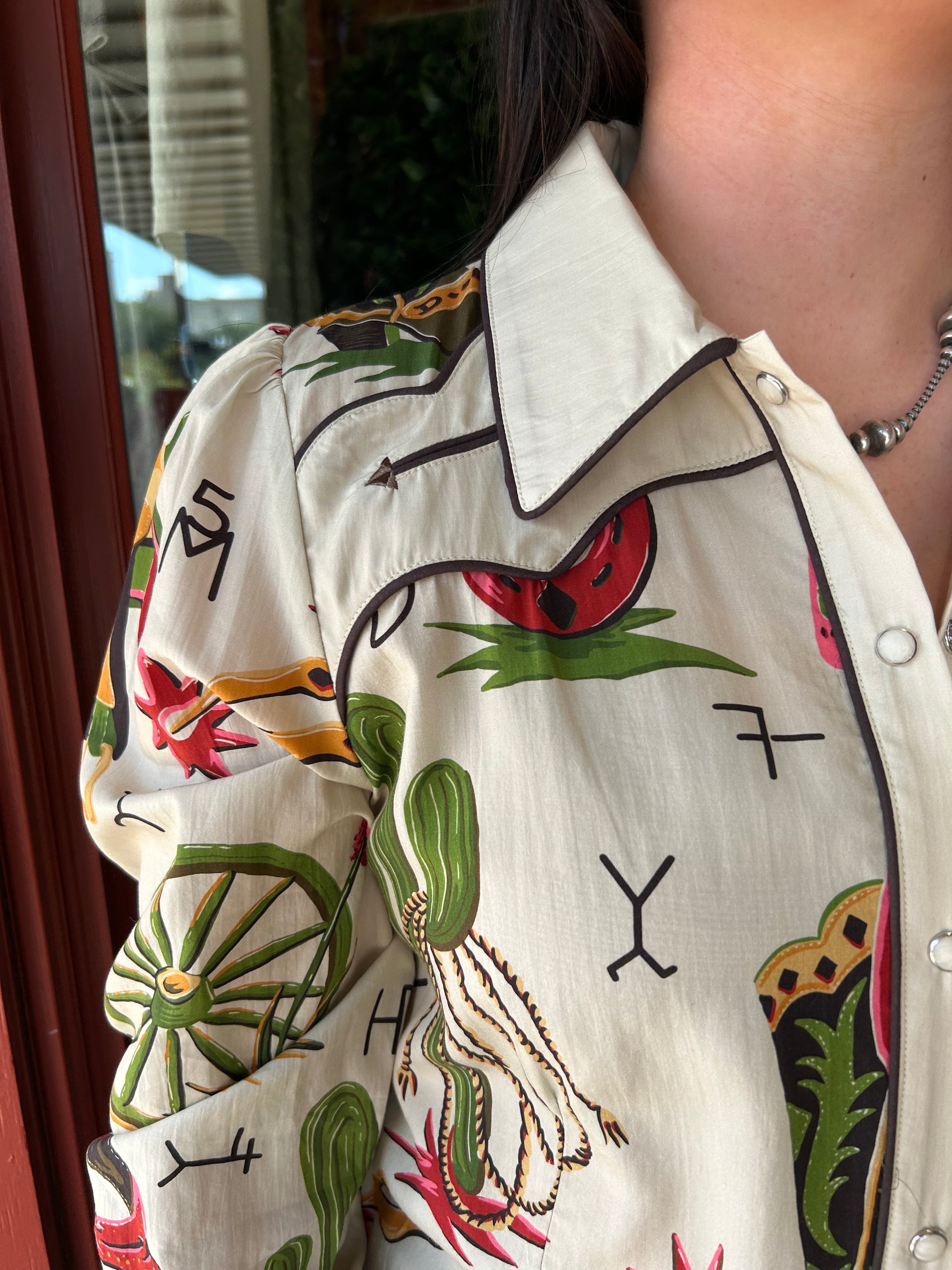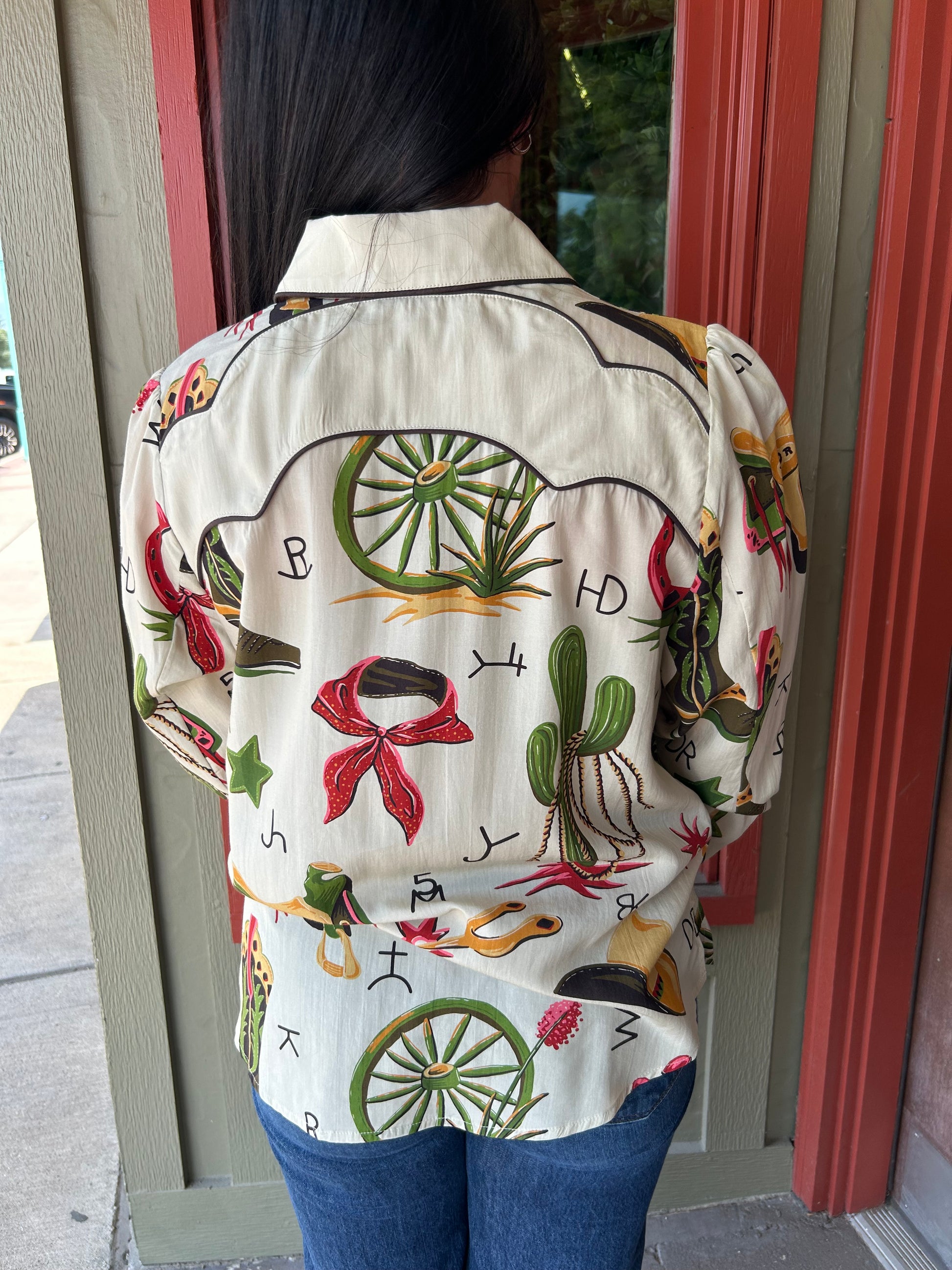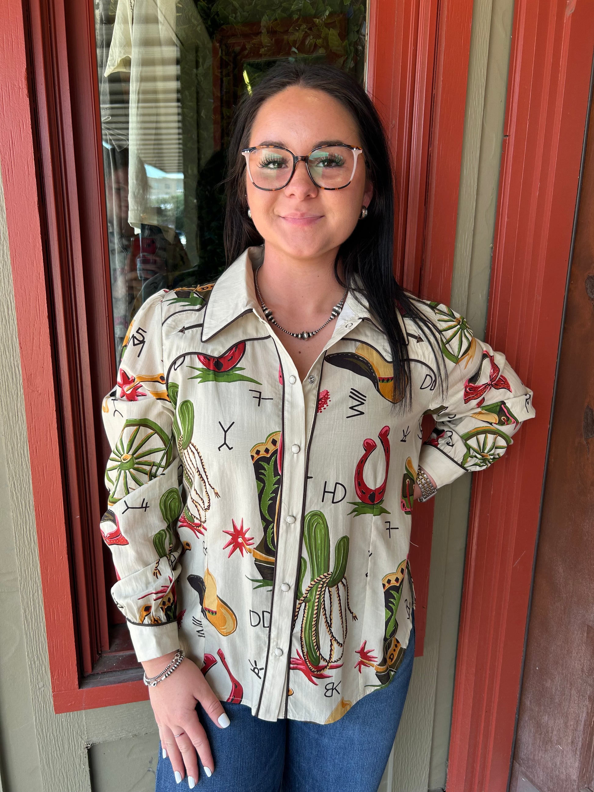 Introducing the Atomic Ranch Top - a playful and quirky addition to your wardrobe! With its adorable design, this top will bring out your fun-loving personality and add a touch of humor to any outfit. Don't miss out on this unique piece - it's sure to be a hit!