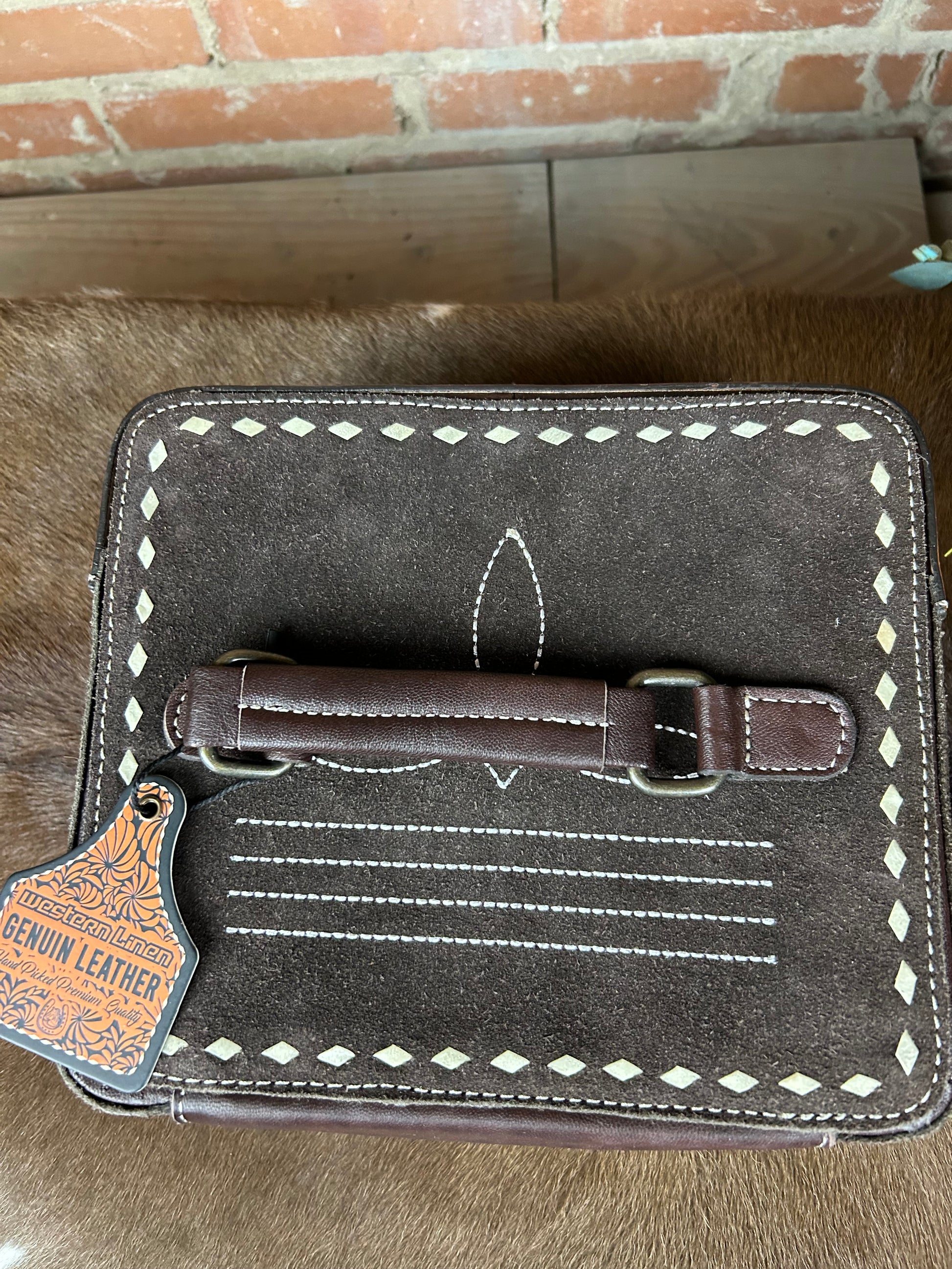 This adorable jewelry box brings Western charm to your vanity! Featuring classic bootstitch detailing and hand-tooled leather craftsmanship, it's the perfect spot to stash your favorite rings, earrings, and treasures. The rich chocolate finish adds a touch of rustic elegance to any room. Whether you're a true cowgirl at heart or just love that Texas flair, this little beauty keeps your jewelry organized in style. A delightful gift for anyone who appreciates authentic Western aesthetics!