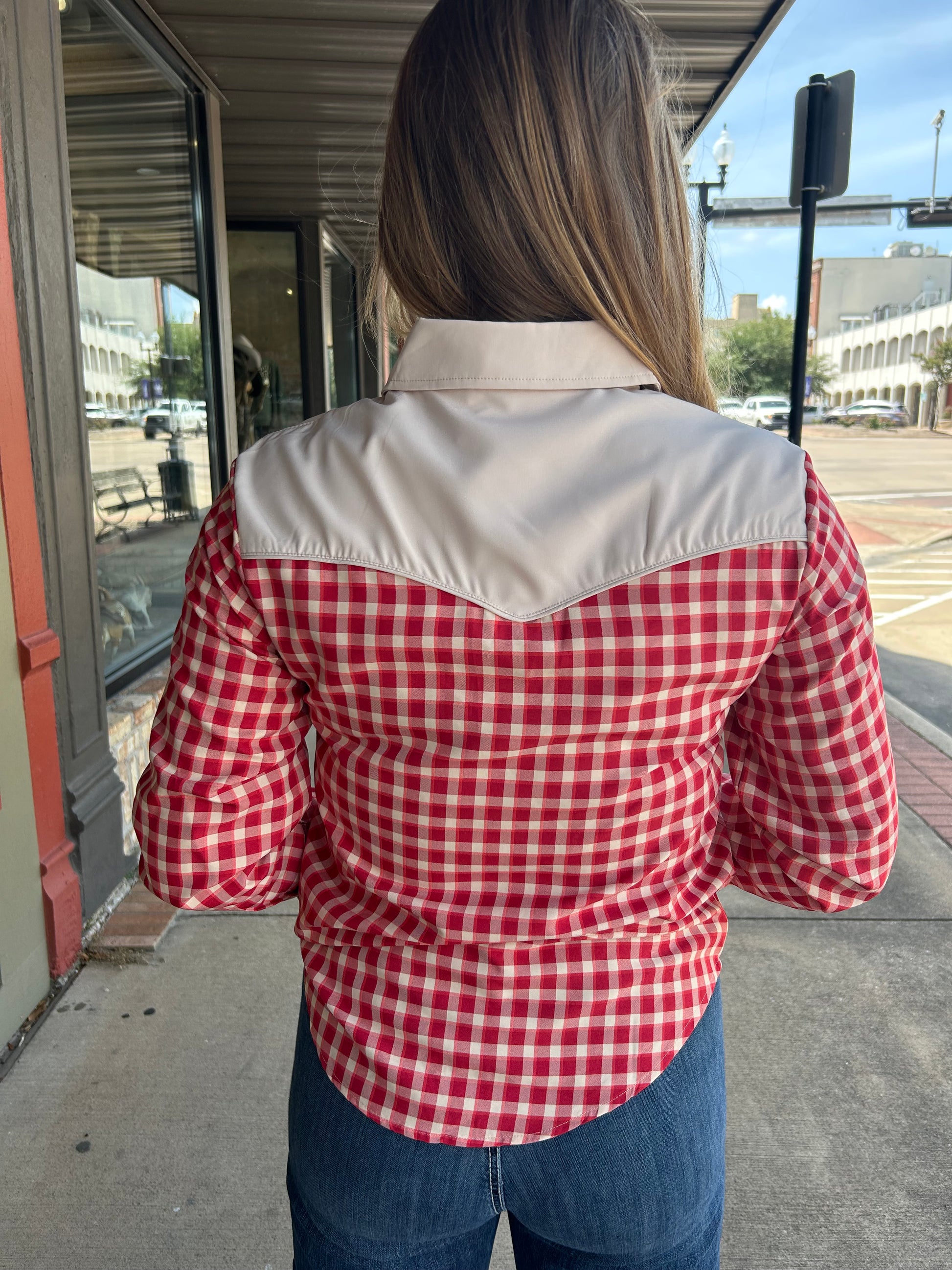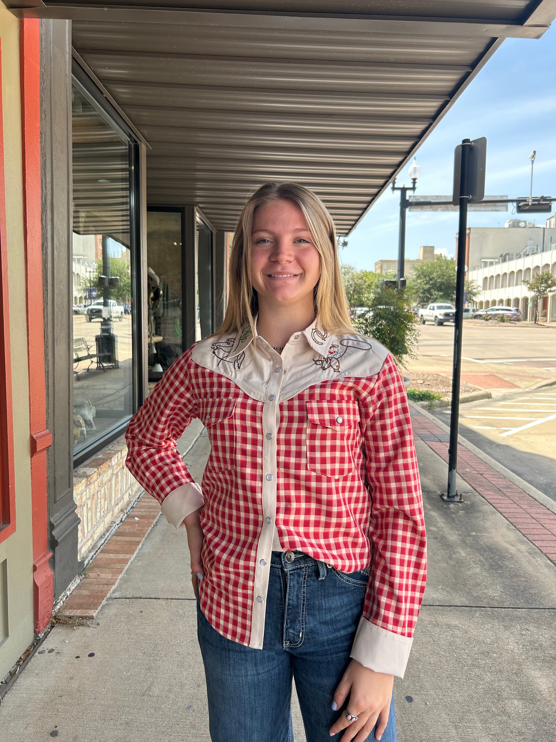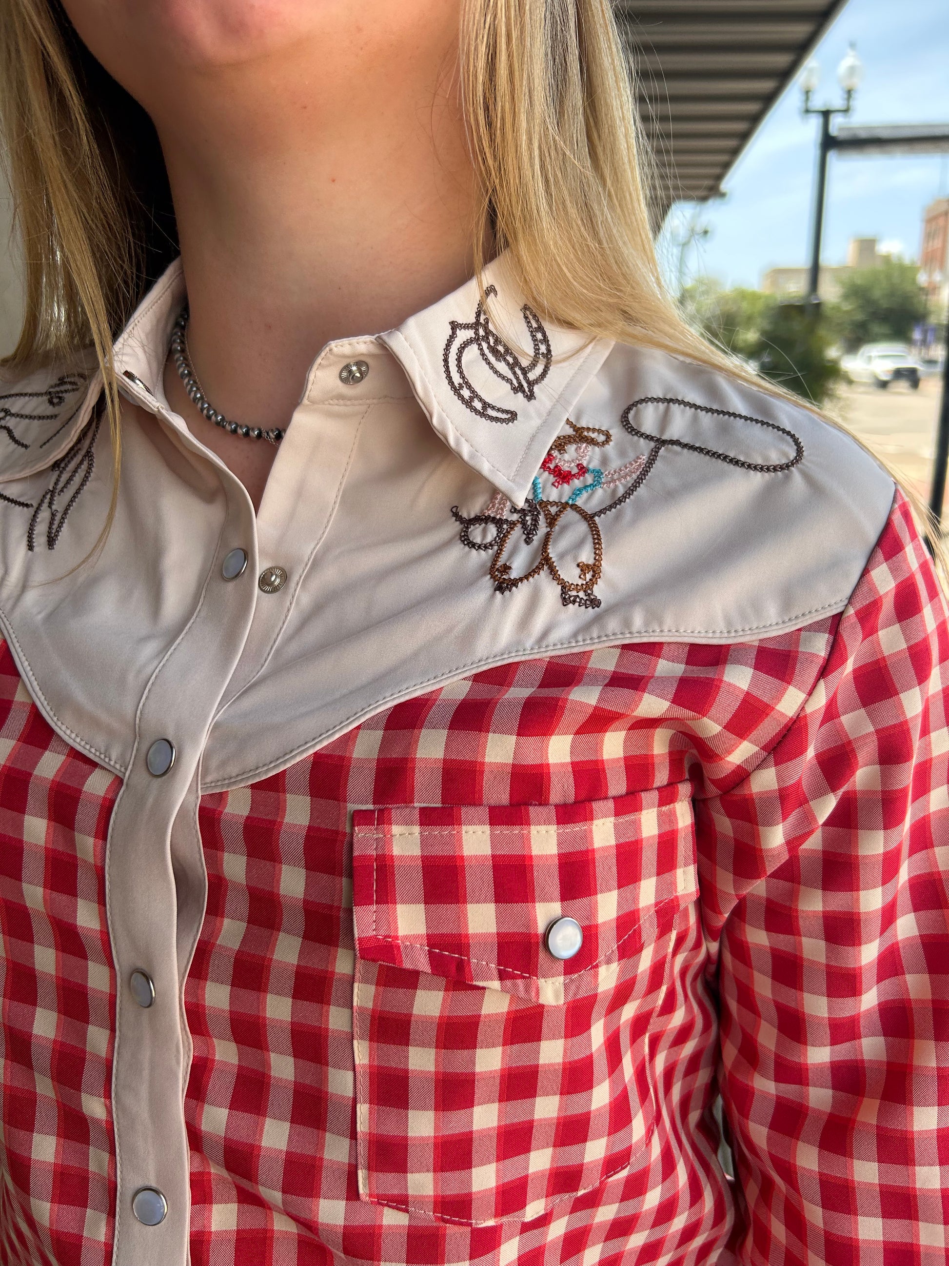 Saddle up in style with our Jimdandy Shirt! Made of red gingham fabric, this western shirt will have you ready for any adventure. With its quirky design and playful tone, you'll stand out in any crowd. Get ready to giddy up and have some fun!