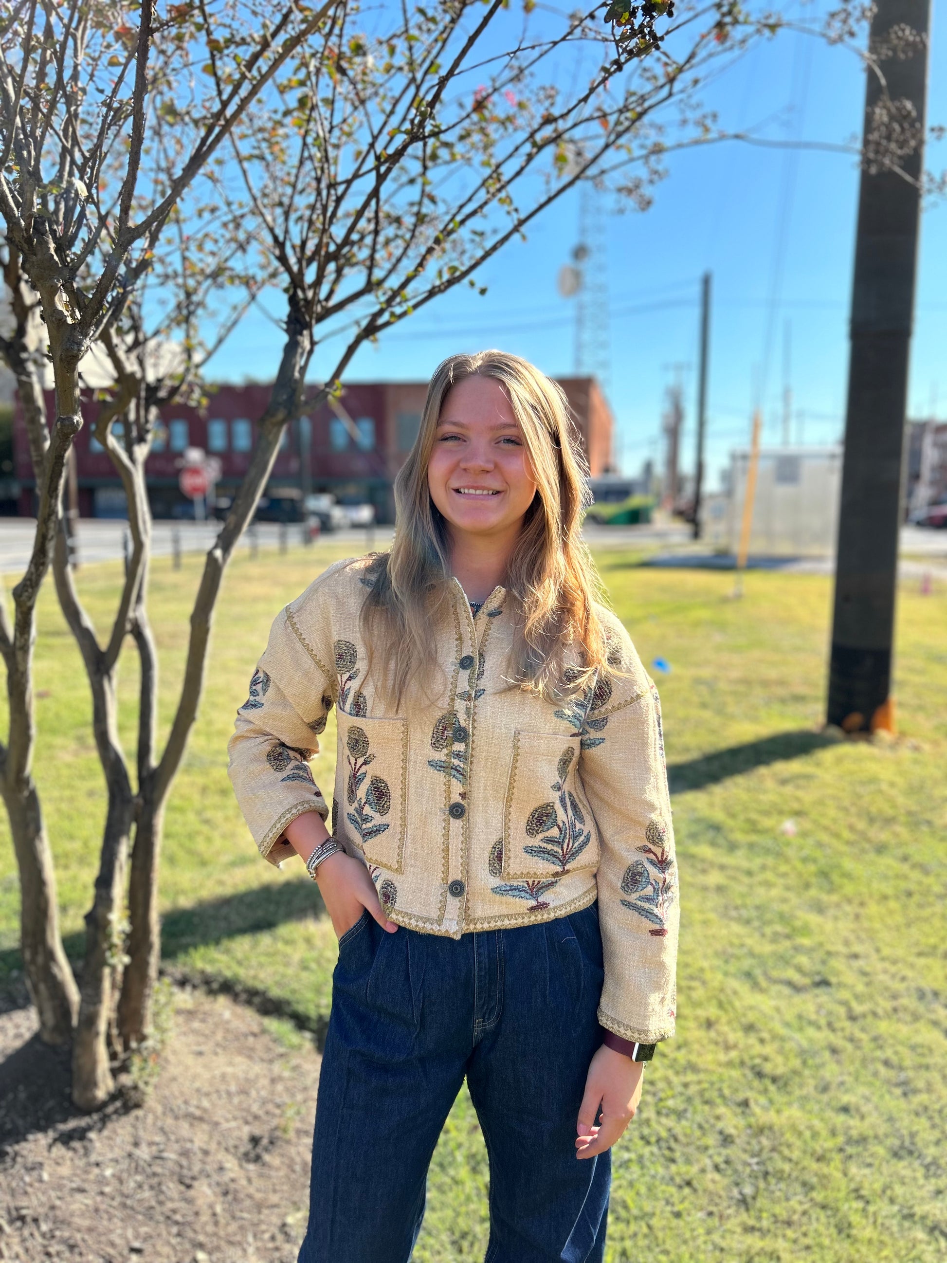Sparkle and shine in this adorable Lurex Block Print Jacket! Featuring eye-catching metallic threading woven throughout a charming block print design, this piece brings instant personality to any outfit. The lightweight construction makes it perfect for layering over your favorite tees or dresses, while the lustrous lurex details catch the light beautifully. Whether you're heading out for a casual day or dressing up for something special, this jacket adds that perfect touch of shimmer and whimsy. A fun, statement-making essential that'll have you feeling fabulous!
