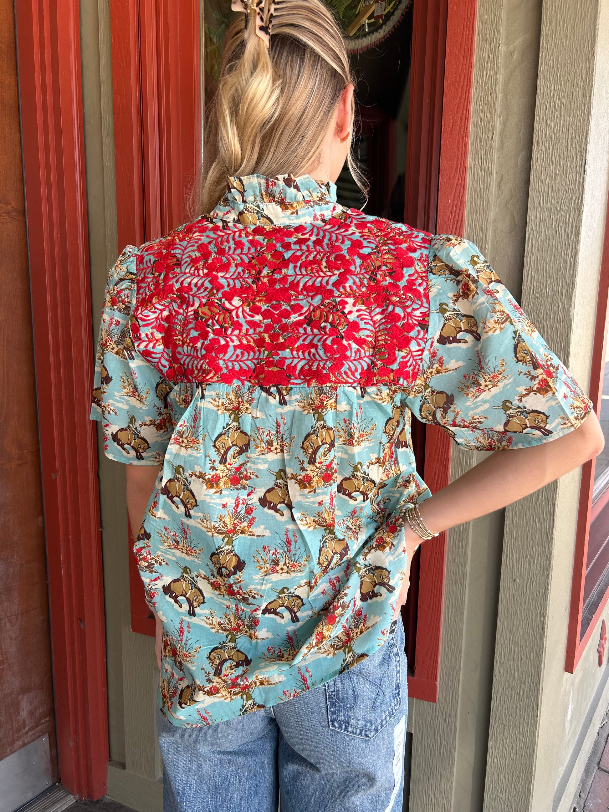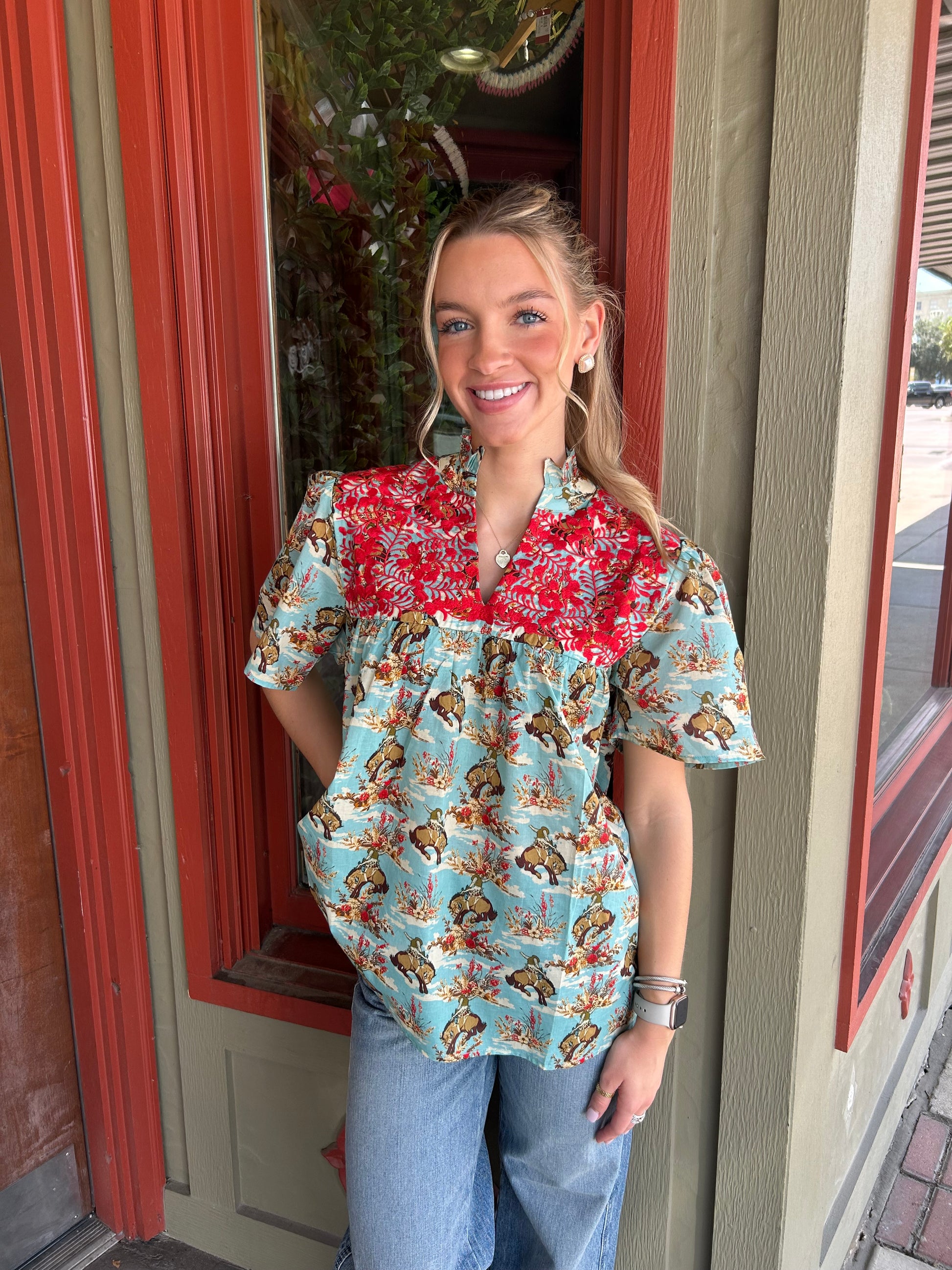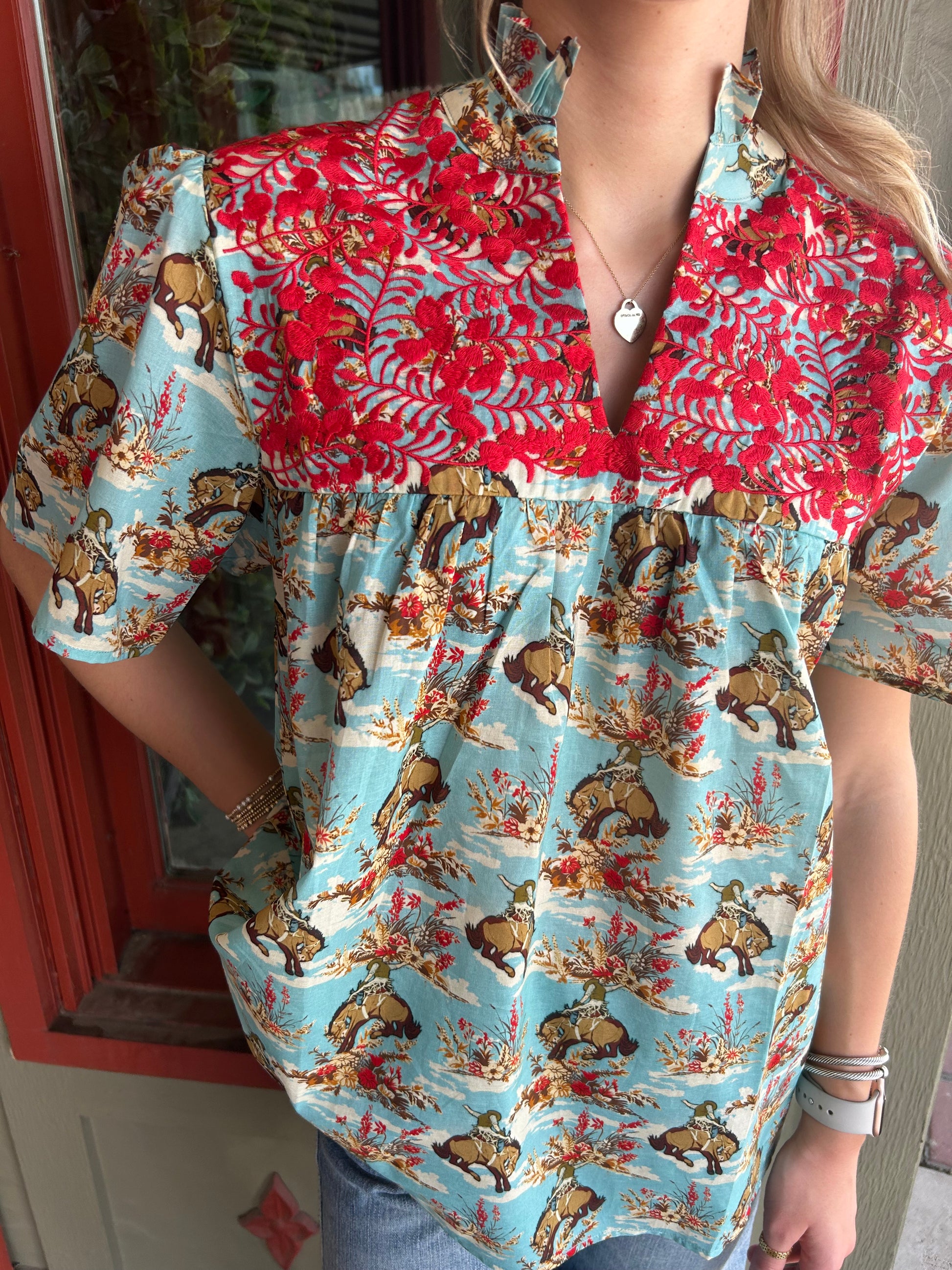 Unleash your inner cowgirl with the Reece Bucking Horse Top! This cute top brings some playful rodeo vibes to any outfit. Perfect for a day out with friends or a night on the town, this top is sure to turn heads and make a statement. Saddle up and add some pizzazz to your wardrobe!