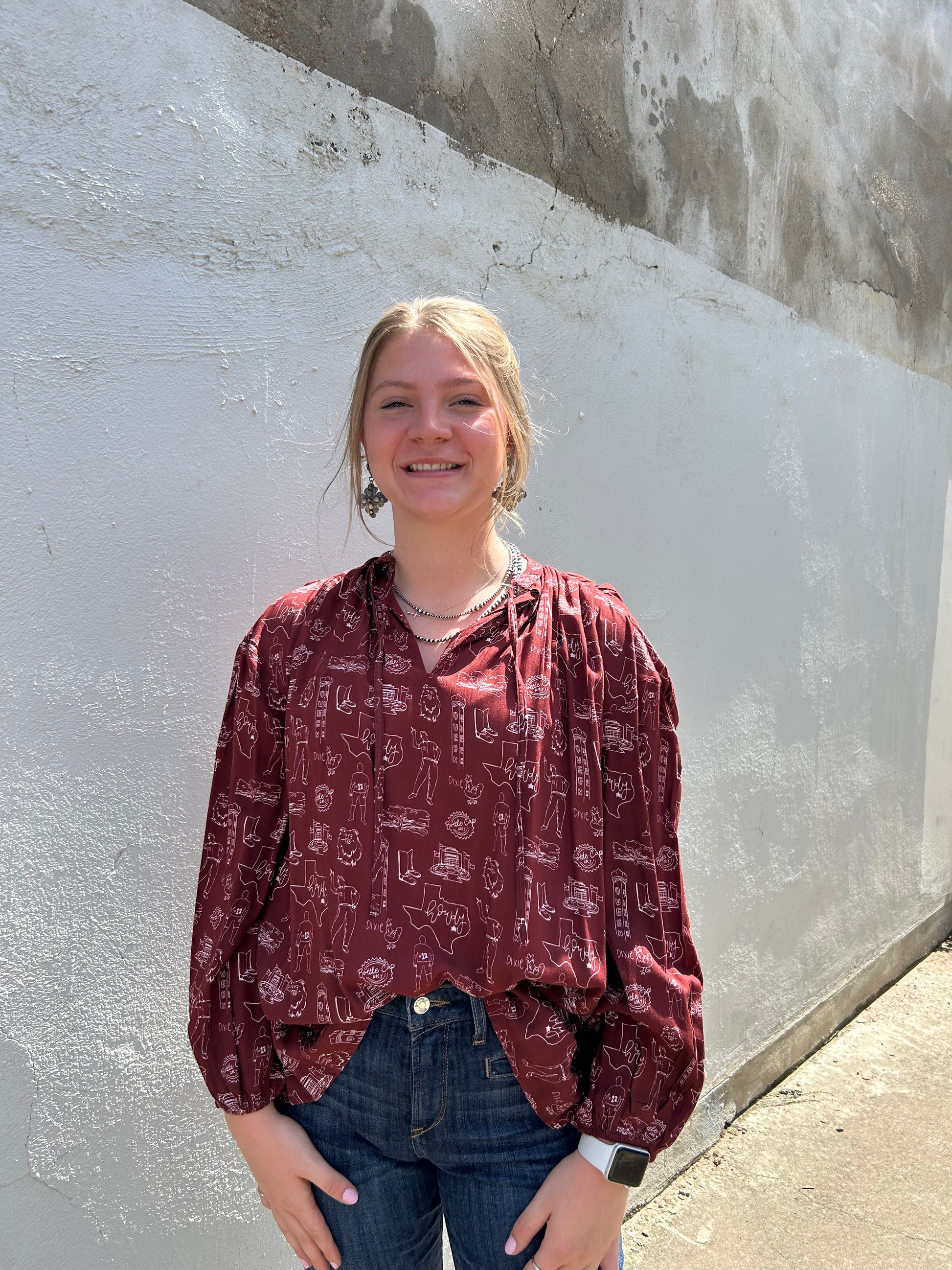 Get ready to show off your love for A&M with the Robyn Top! This classic maroon shirt features a playful twist with a string on the collar. Perfect for all your college station favorites. (Gig 'em!)