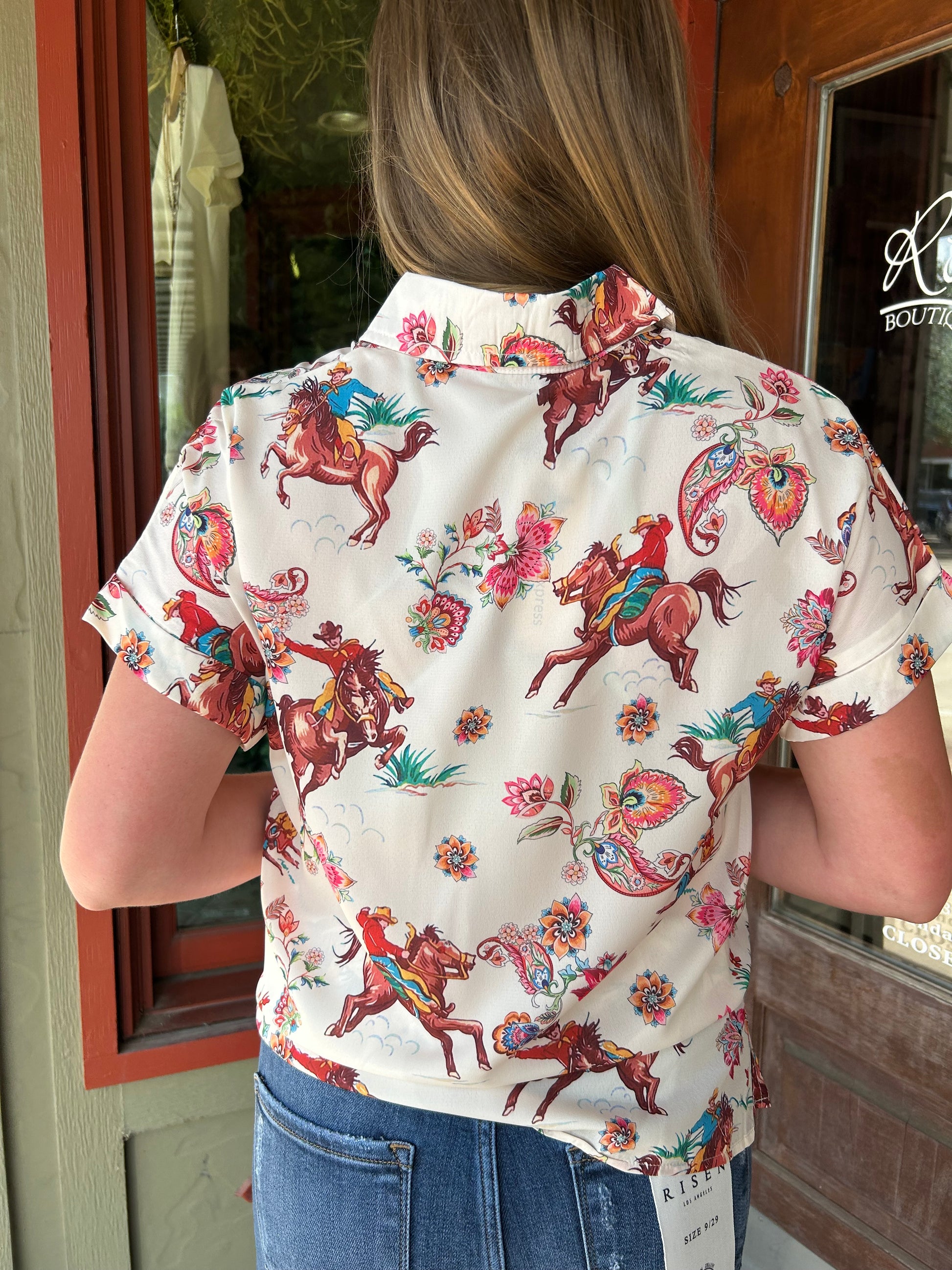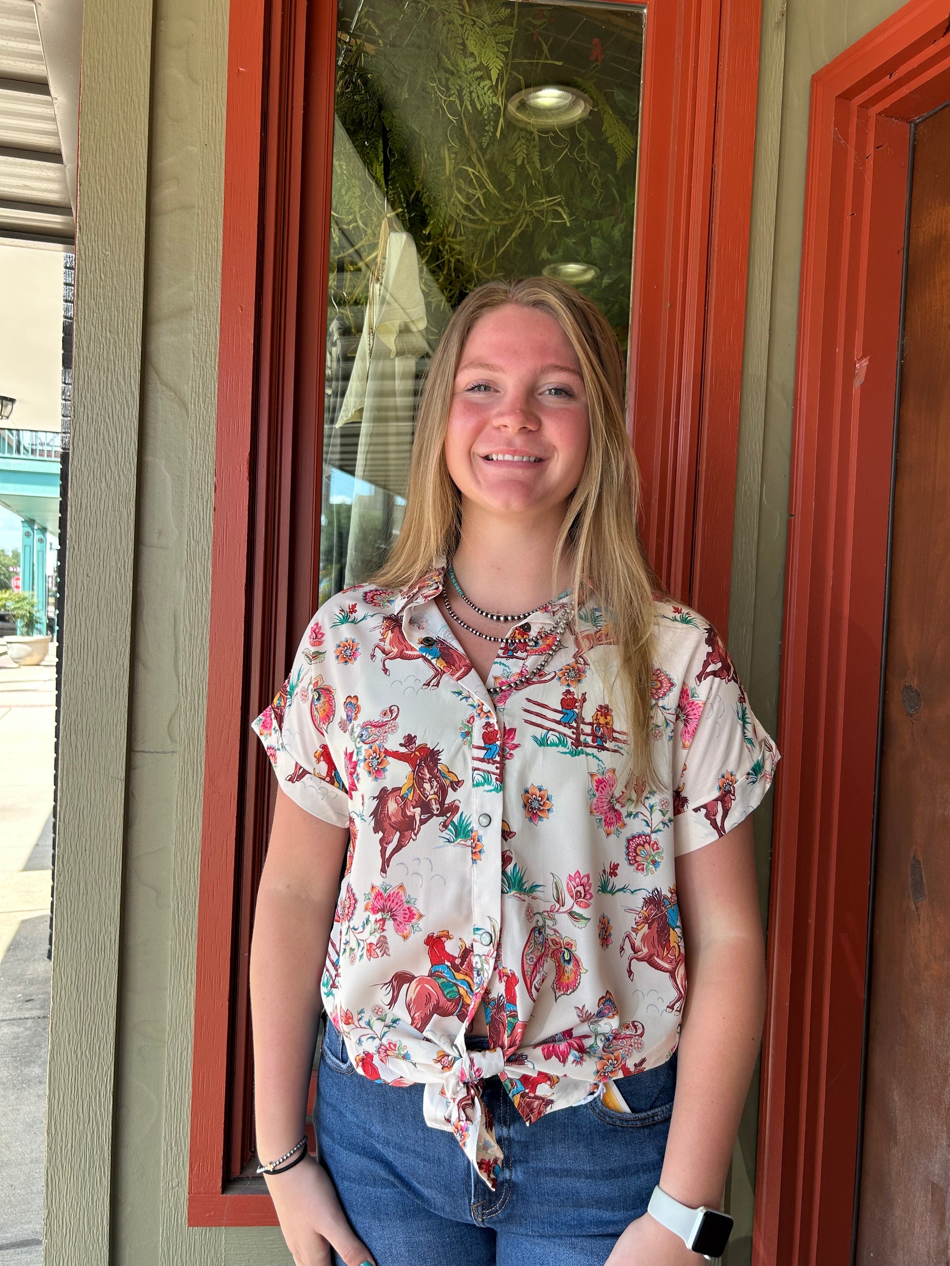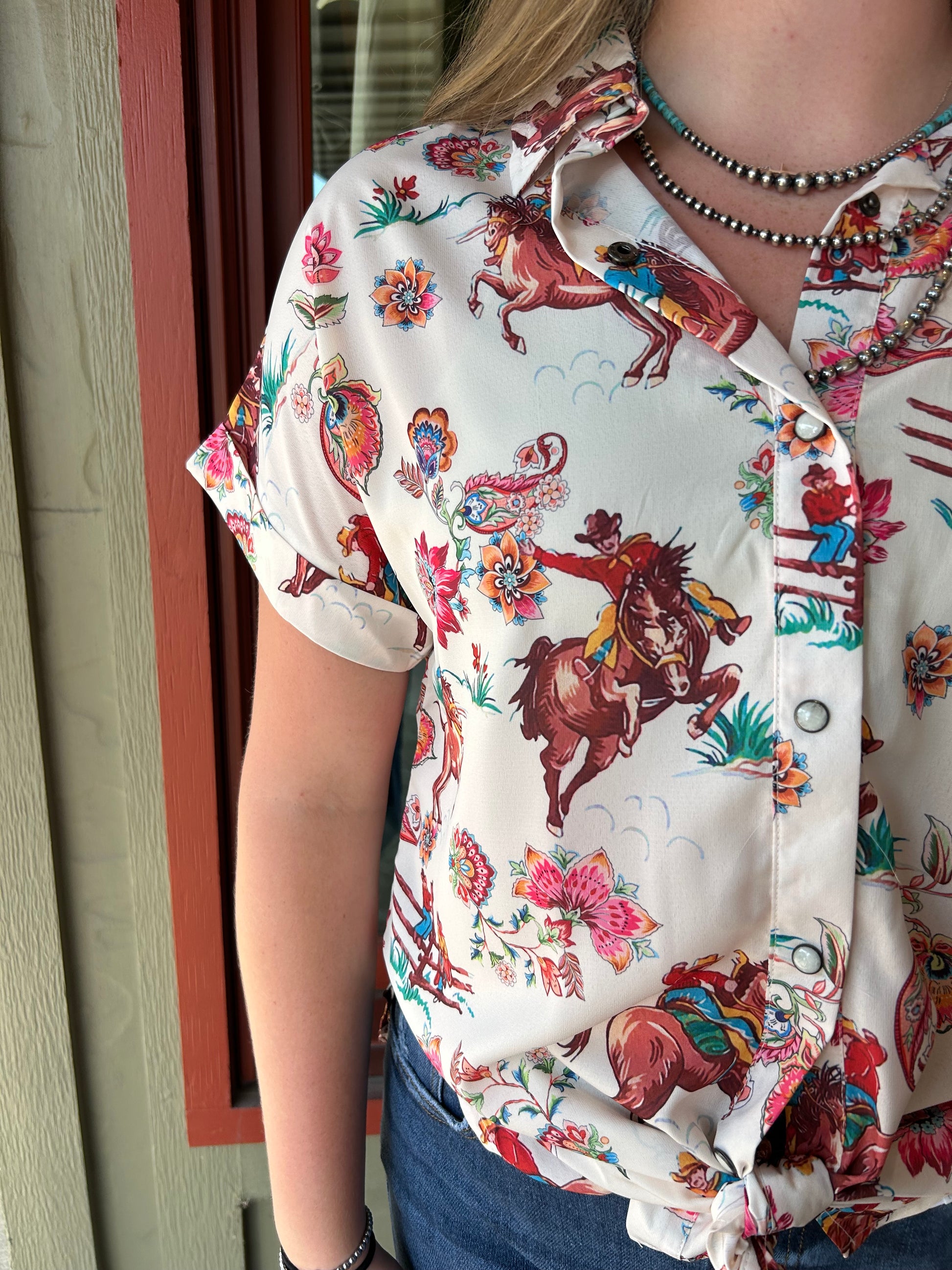 Get ready to giddy up in the Rodeo Rose Shirt - Cream! With its cute design and cream color, you'll be the talk of the town. Perfect for any casual occasion, this shirt is a must-have for any cowgirl or cowboy. So don't wait, grab yours now and rock that rodeo look with style!(Yee-haw!)