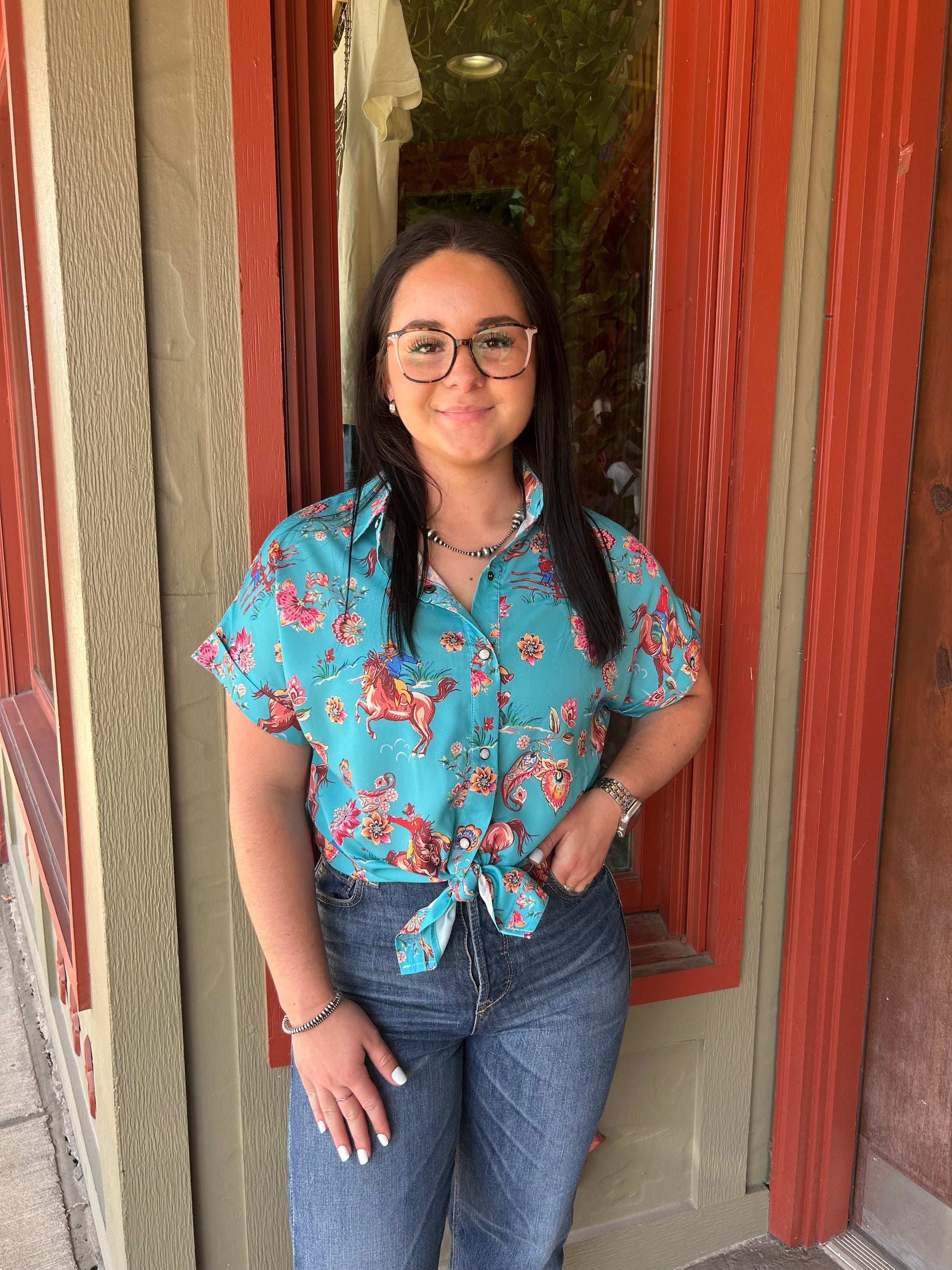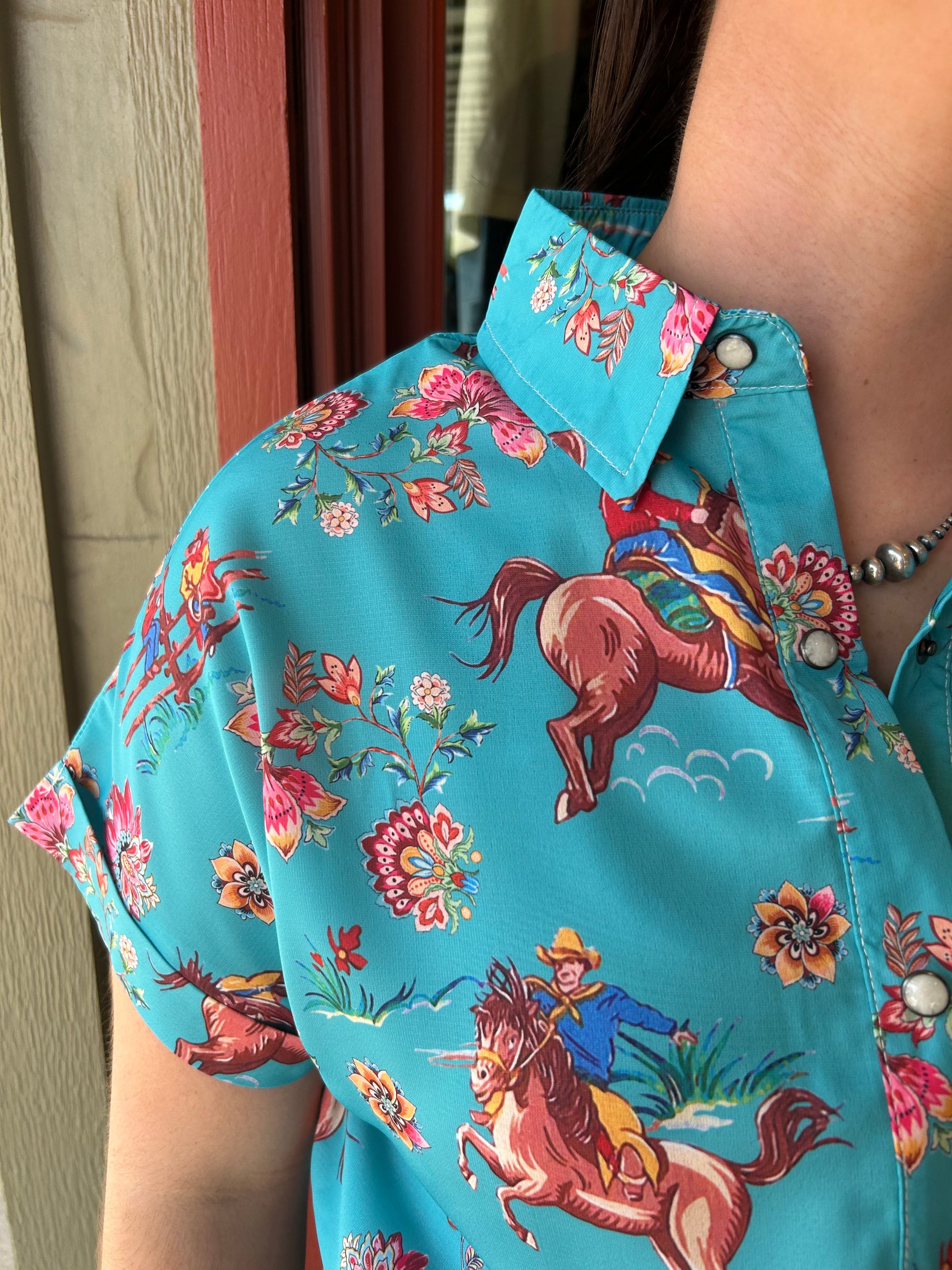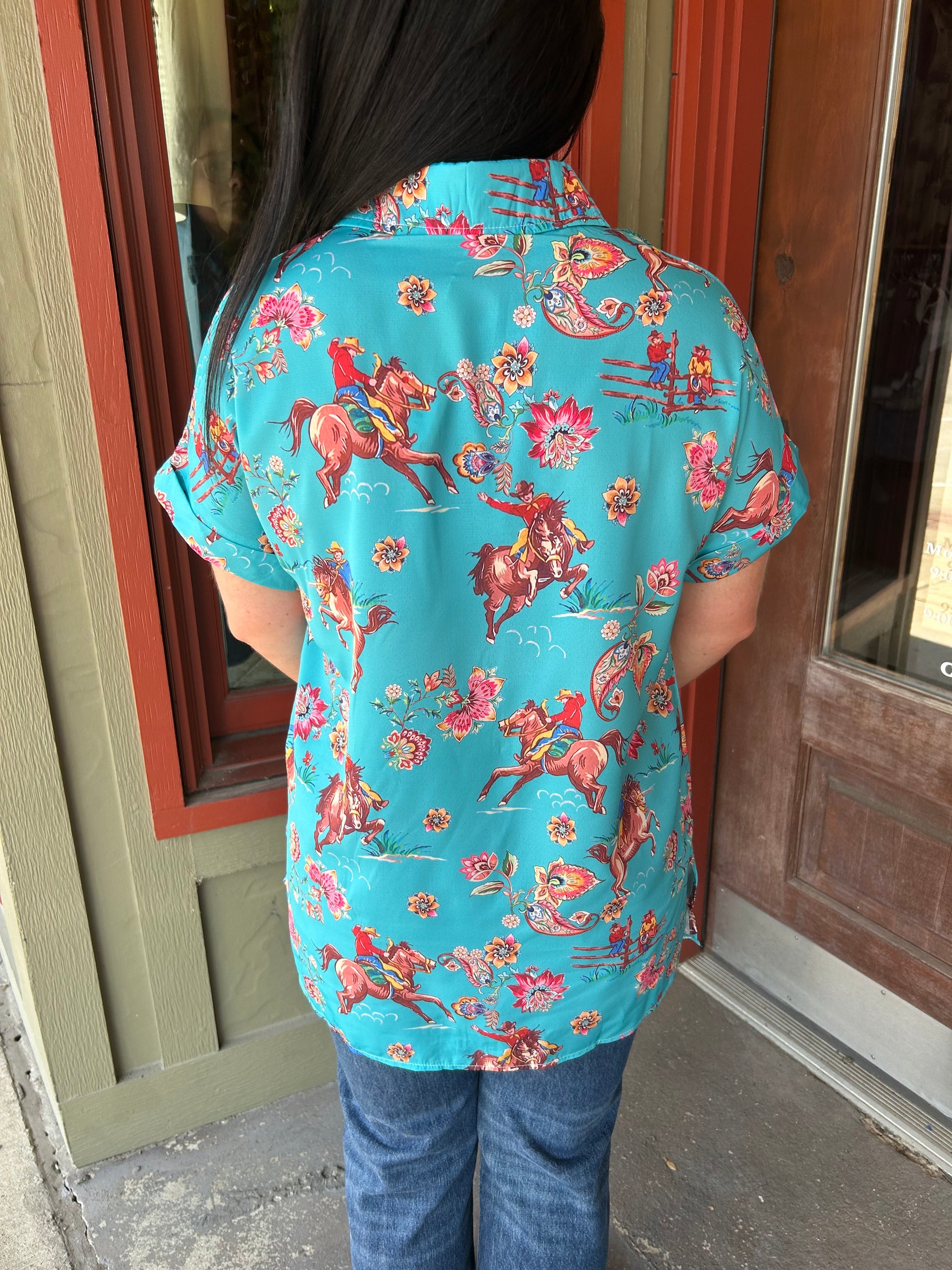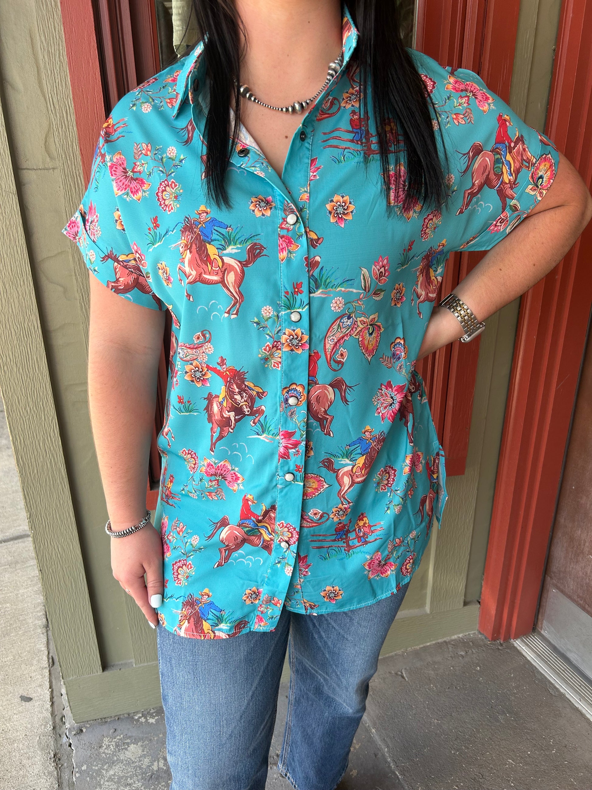 Saddle up with our Rodeo Rose Top! This turquoise top is not only cute, but also brings out your playful side. Perfect for a day out at the ranch or a night out on the town. Yeehaw!