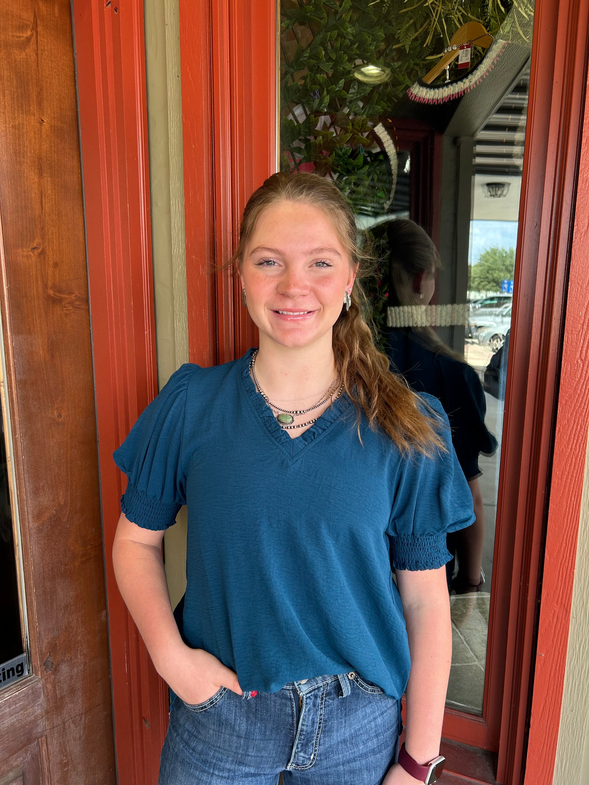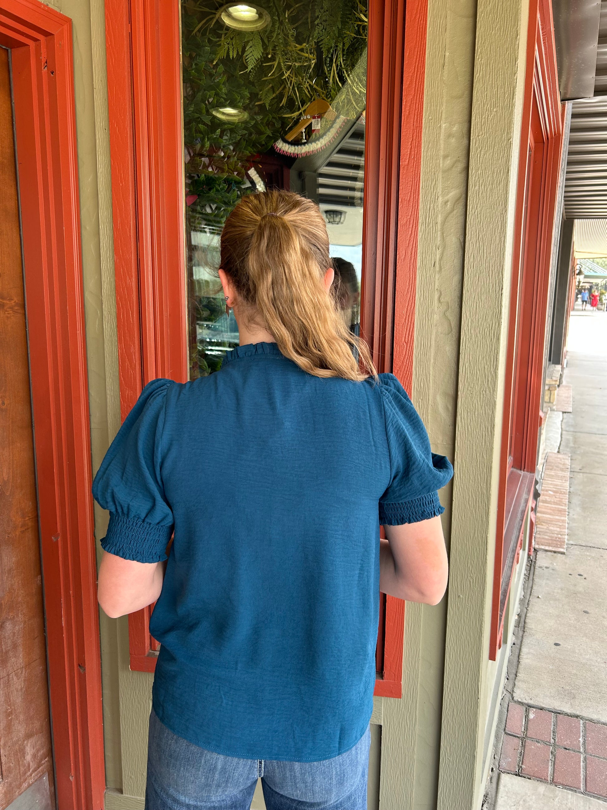 "Add some flair to your wardrobe with our Ruffled Top in Teal! This cute top is perfect for adding some personality to any outfit. Don't be afraid to stand out and show off your unique style. Go ahead, ruffle some feathers!"