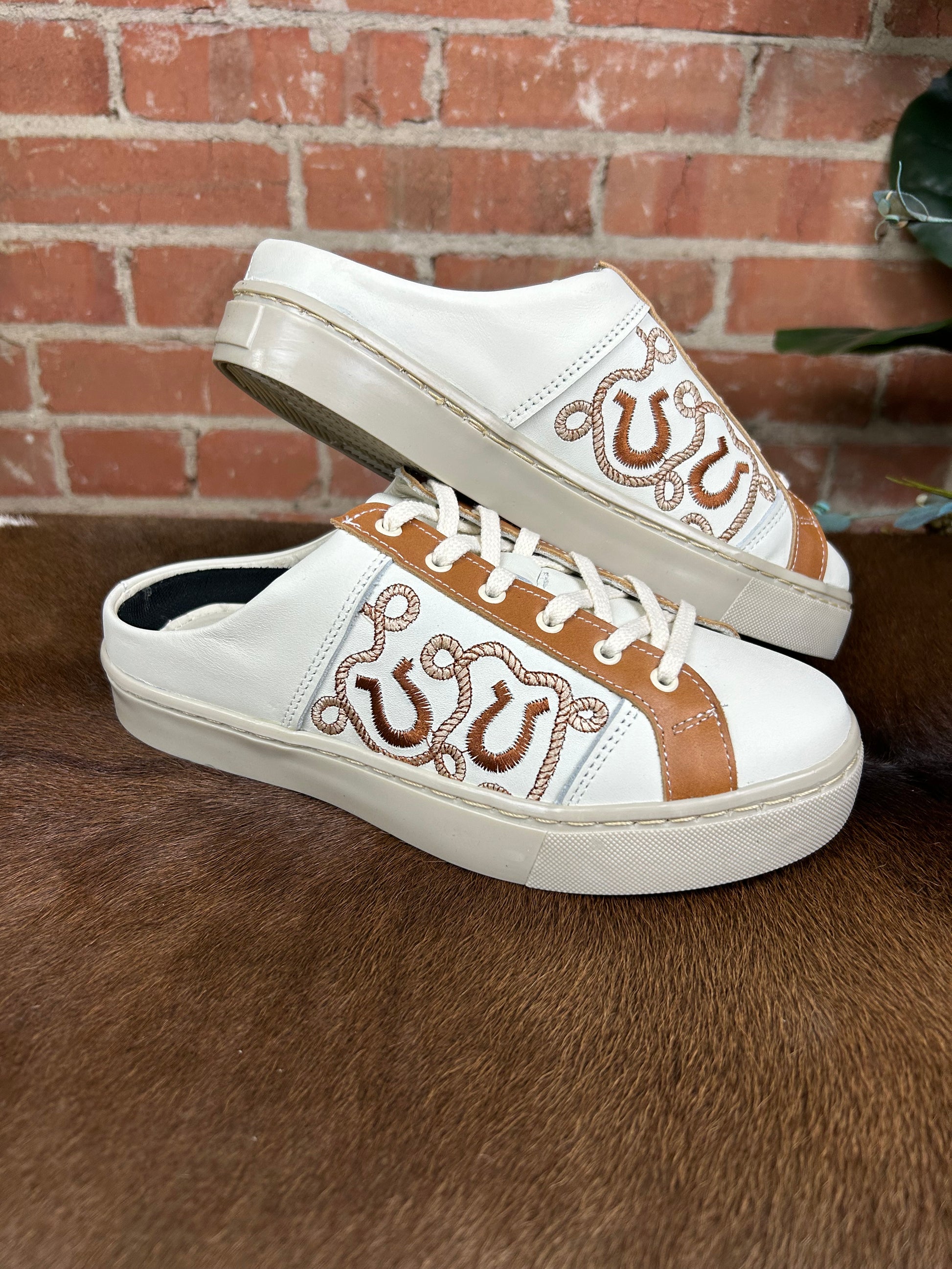 The Shelly Luck Tennis Shoe features a unique horseshoe and rope detail, making it stand out from other athletic shoes. Its slip-on design allows for easy on and off, while its true-to-size fit ensures comfort and support. Perfect for any tennis enthusiast looking to elevate their game.