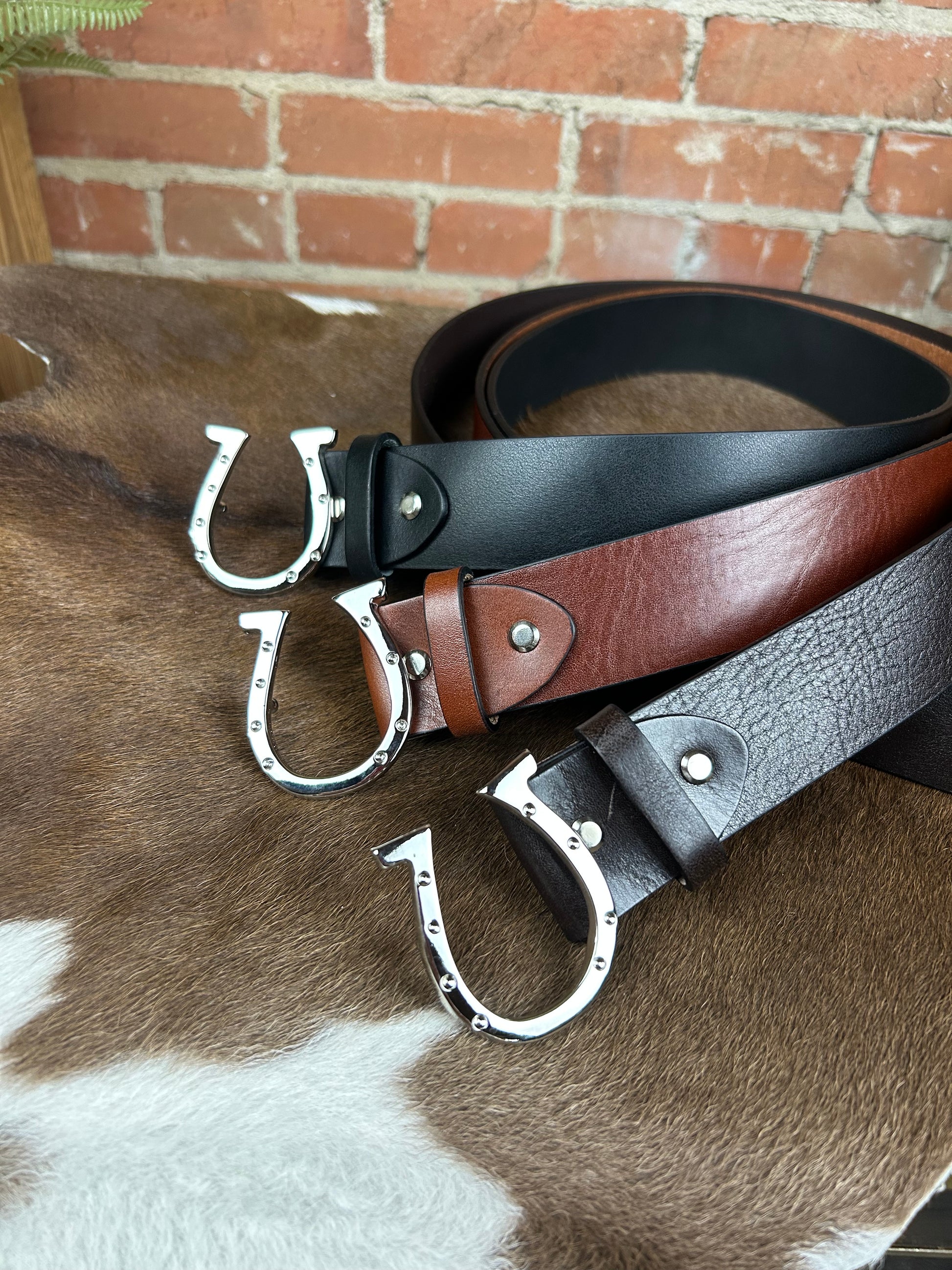 Saddle up in style with this charming Silver Horton Horseshoe Belt! Perfect for adding a touch of Western flair to any outfit, this adorable accessory features a gleaming silver horseshoe buckle that's sure to turn heads. Whether you're heading to a rodeo, a casual day out, or just want to embrace your inner cowgirl, this belt delivers authentic Texas charm with a playful twist. The quality craftsmanship ensures it'll be your go-to accessory for years to come. Giddy up and grab yours today!