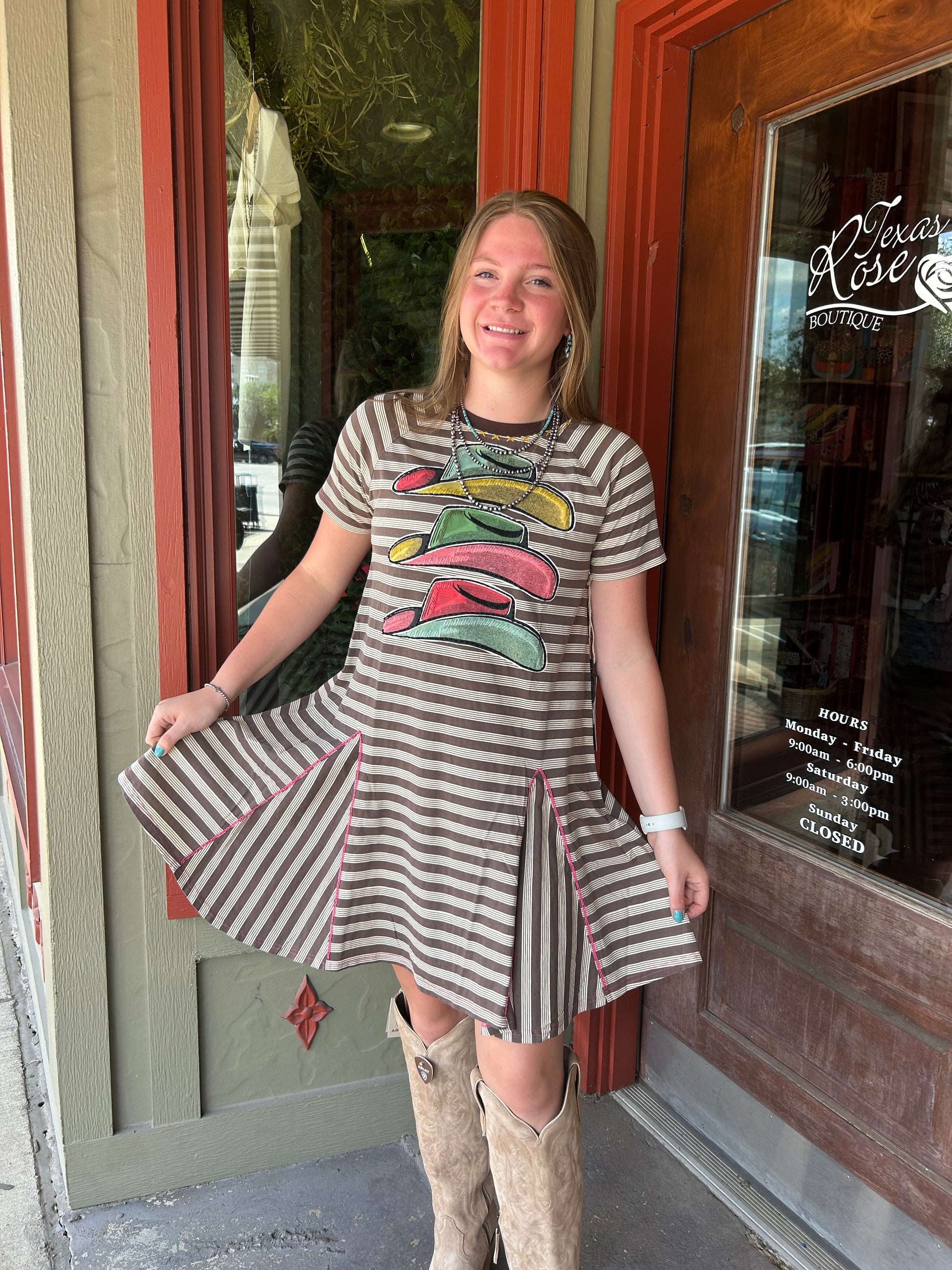 This dress is more than just cute, it's "adorable"! Made with a soft and flowy fabric, it's perfect for any occasion. With its playful design and flattering fit, you'll be turning heads and having fun all day long. Go ahead and add this Texas Toupee Dress to your wardrobe - it'll bring a smile to your face every time you wear it!