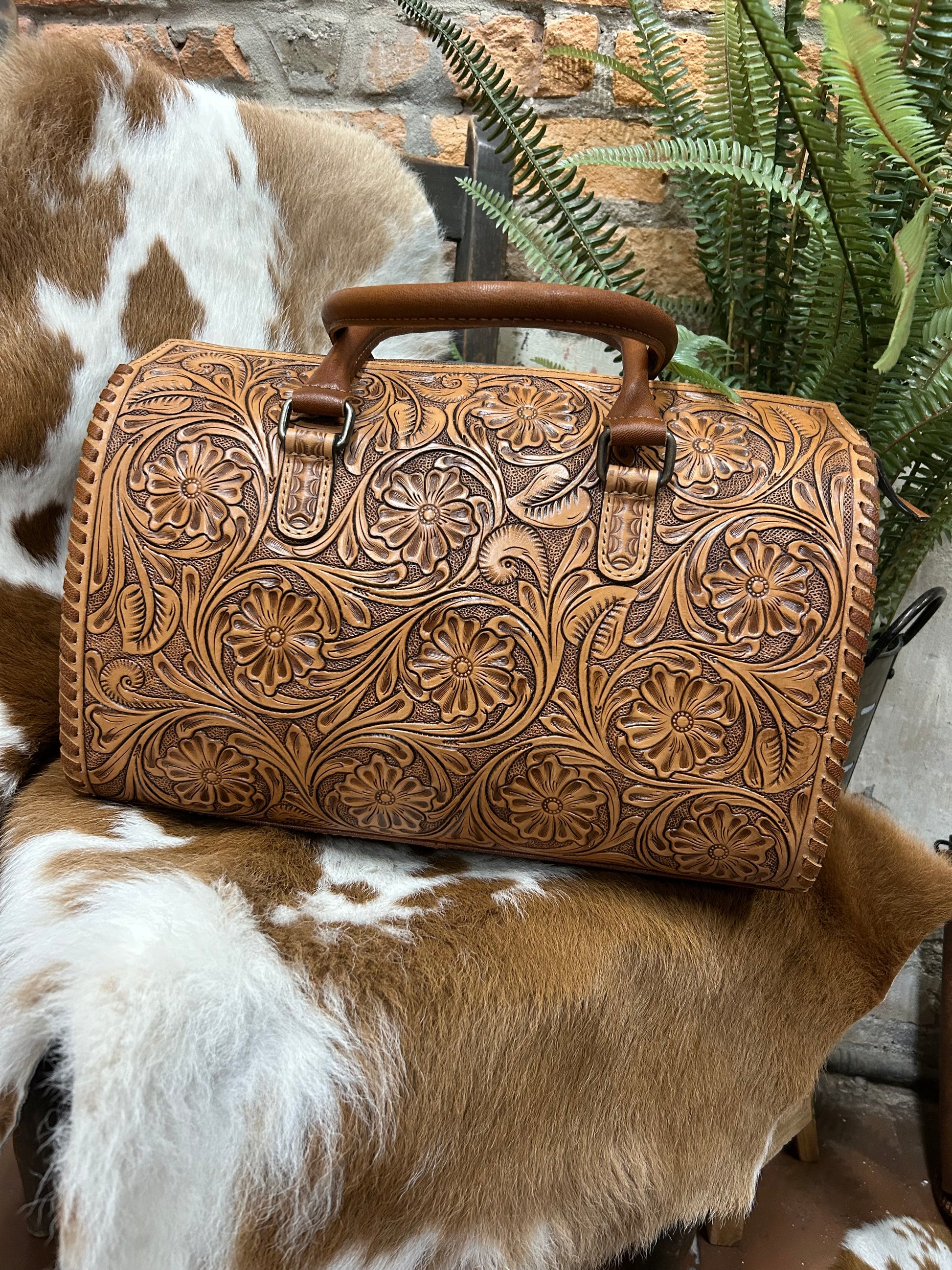 Perfect brown barrel purse with a 3/4 inch tooled leather strap. Includes 2 open pockets and a single zipped pocket.