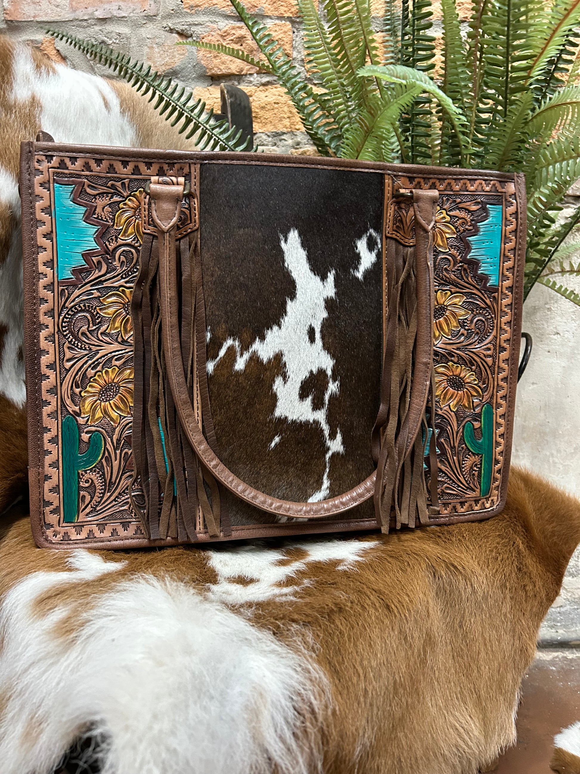 Perfect tote purse with a double shoulder strap and 1 inch tooled leather! includes concealed carry and 2 open pockets with a single zipped pocket.