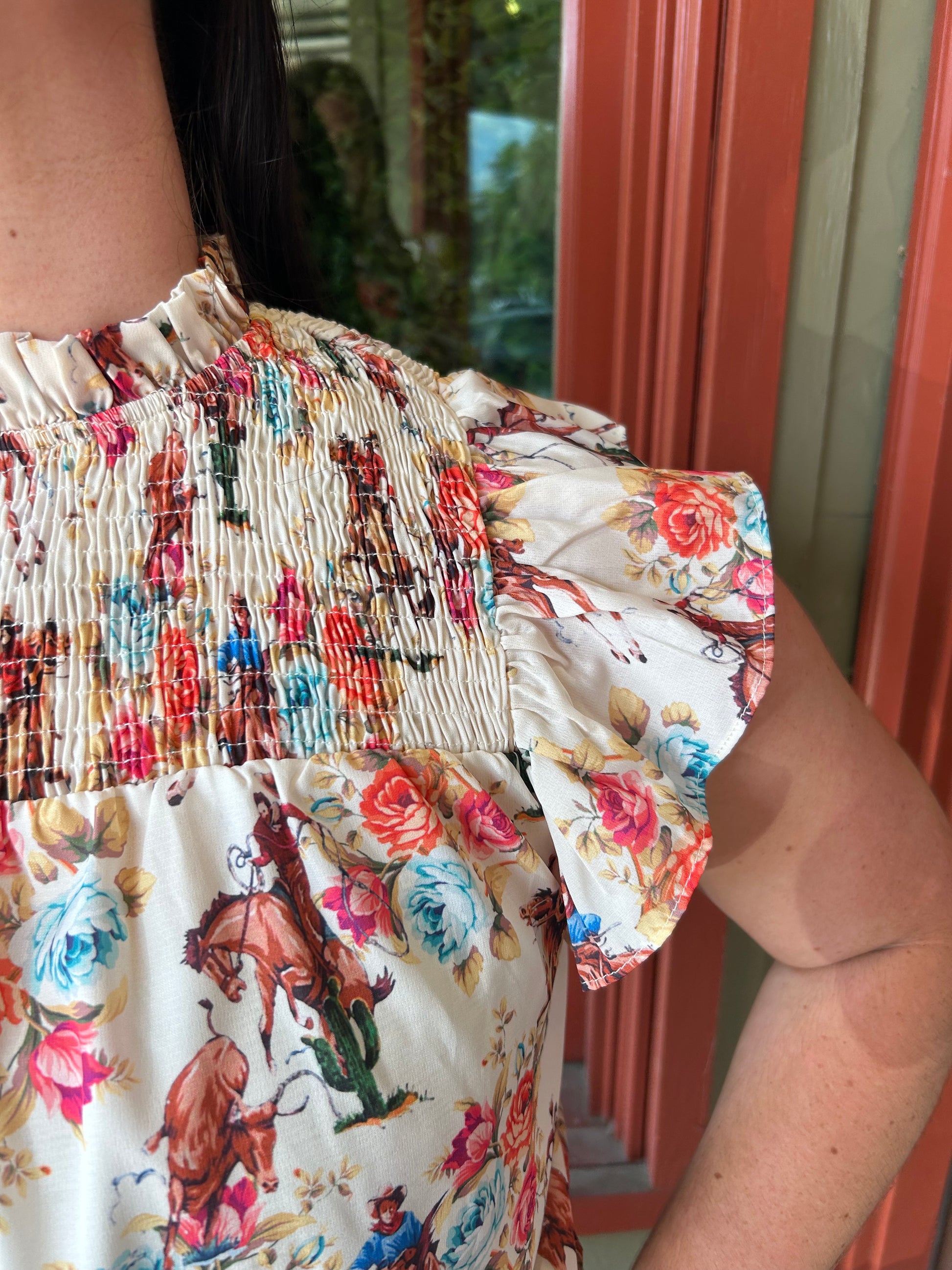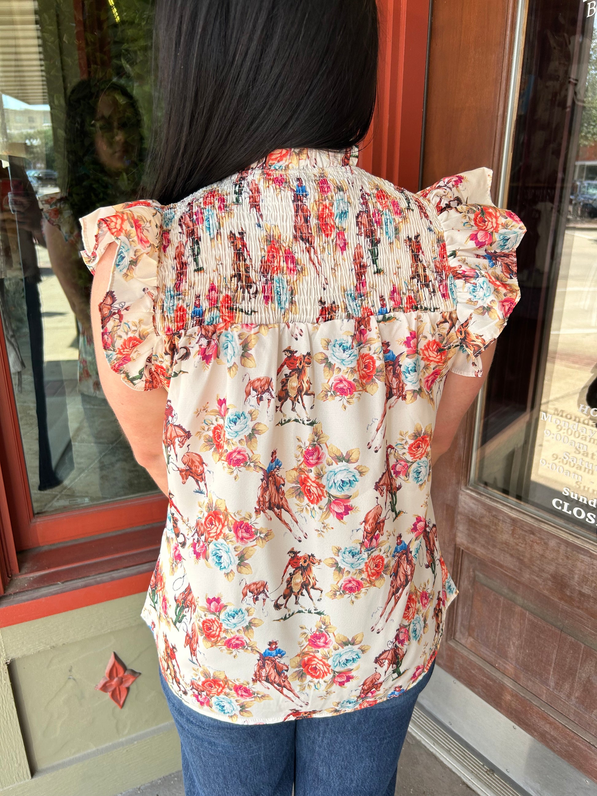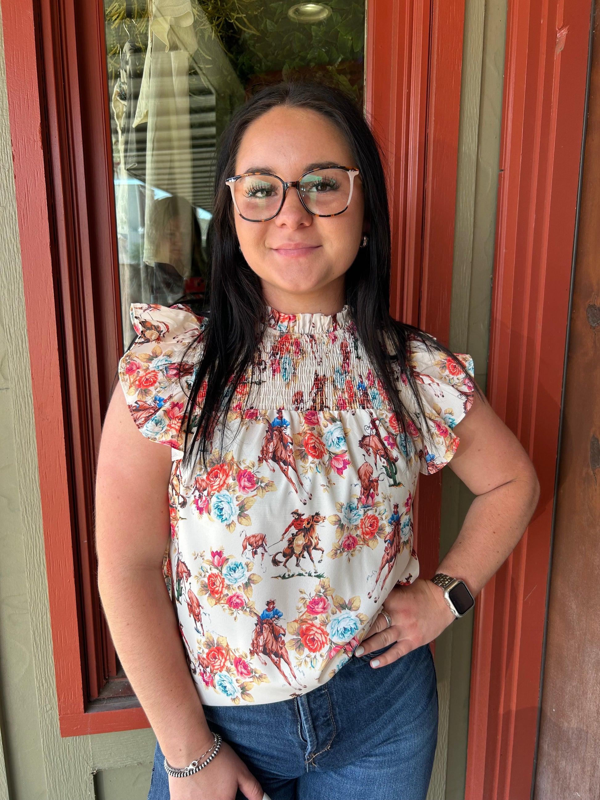 This cream-colored top is not just cute, it's downright adorable! With its Western-inspired rose print and versatile style, it's sure to be a favorite in your wardrobe. Perfect for a casual day out or dressed up for a night on the town, this top is the epitome of effortless charm.