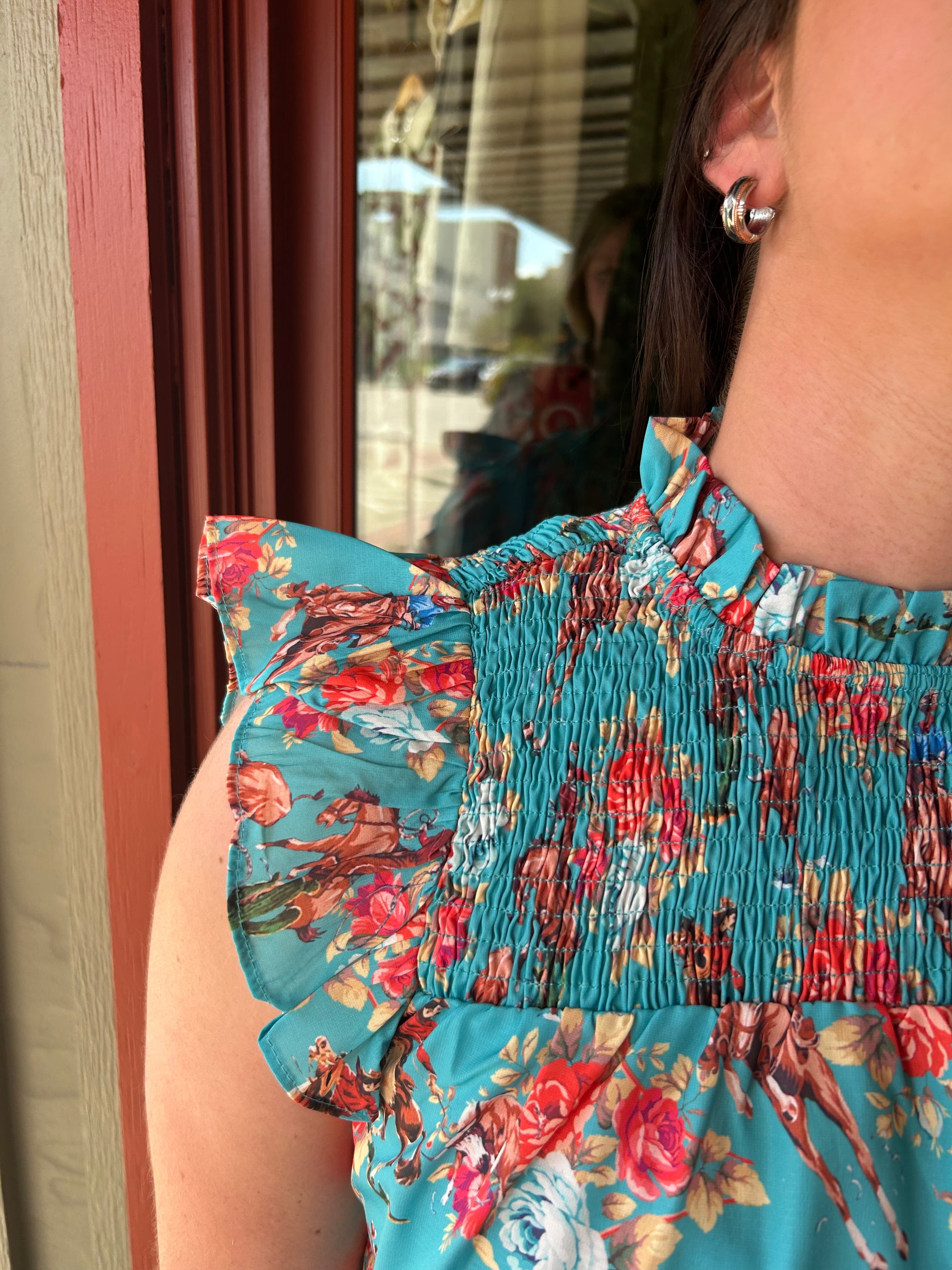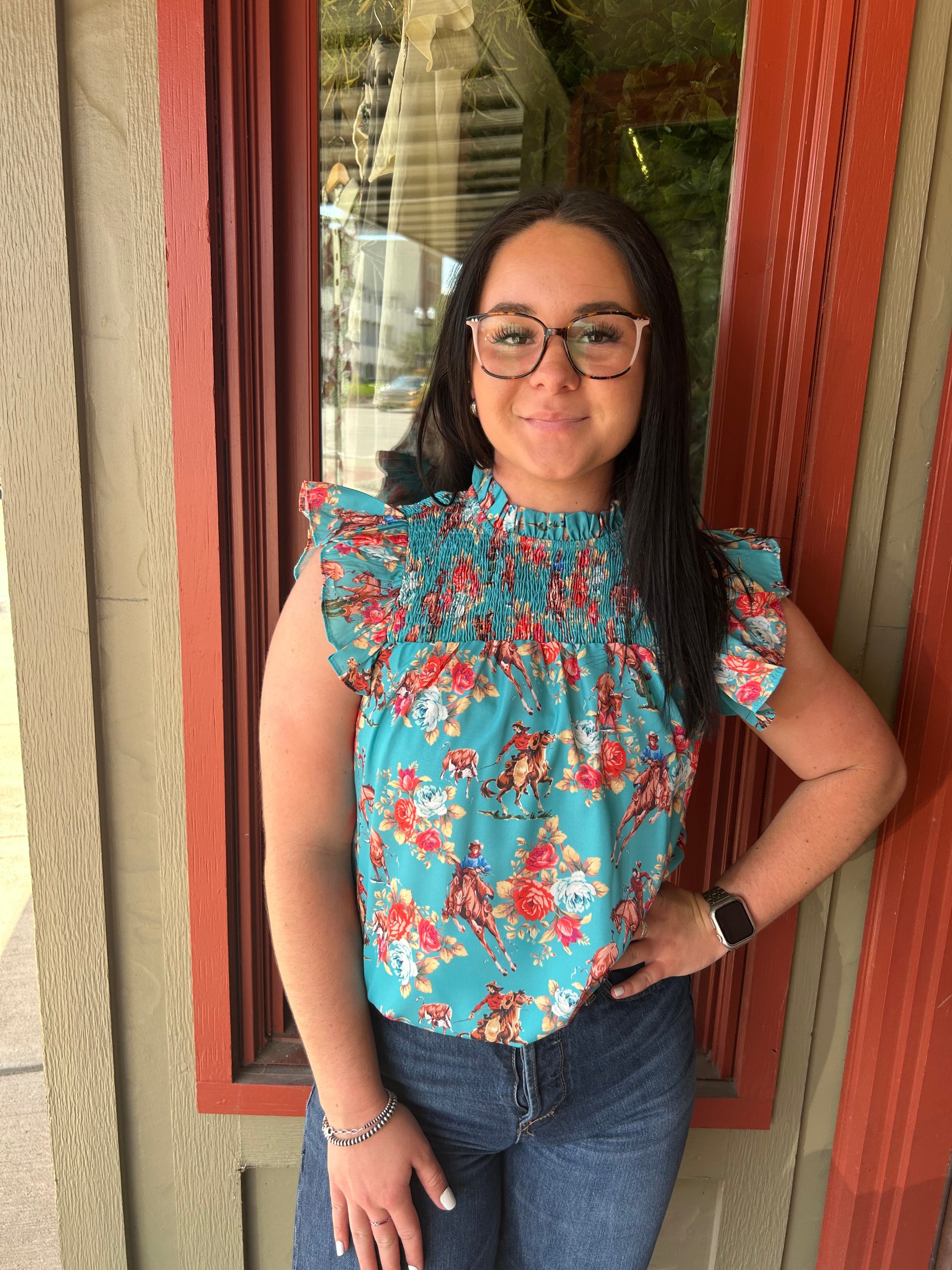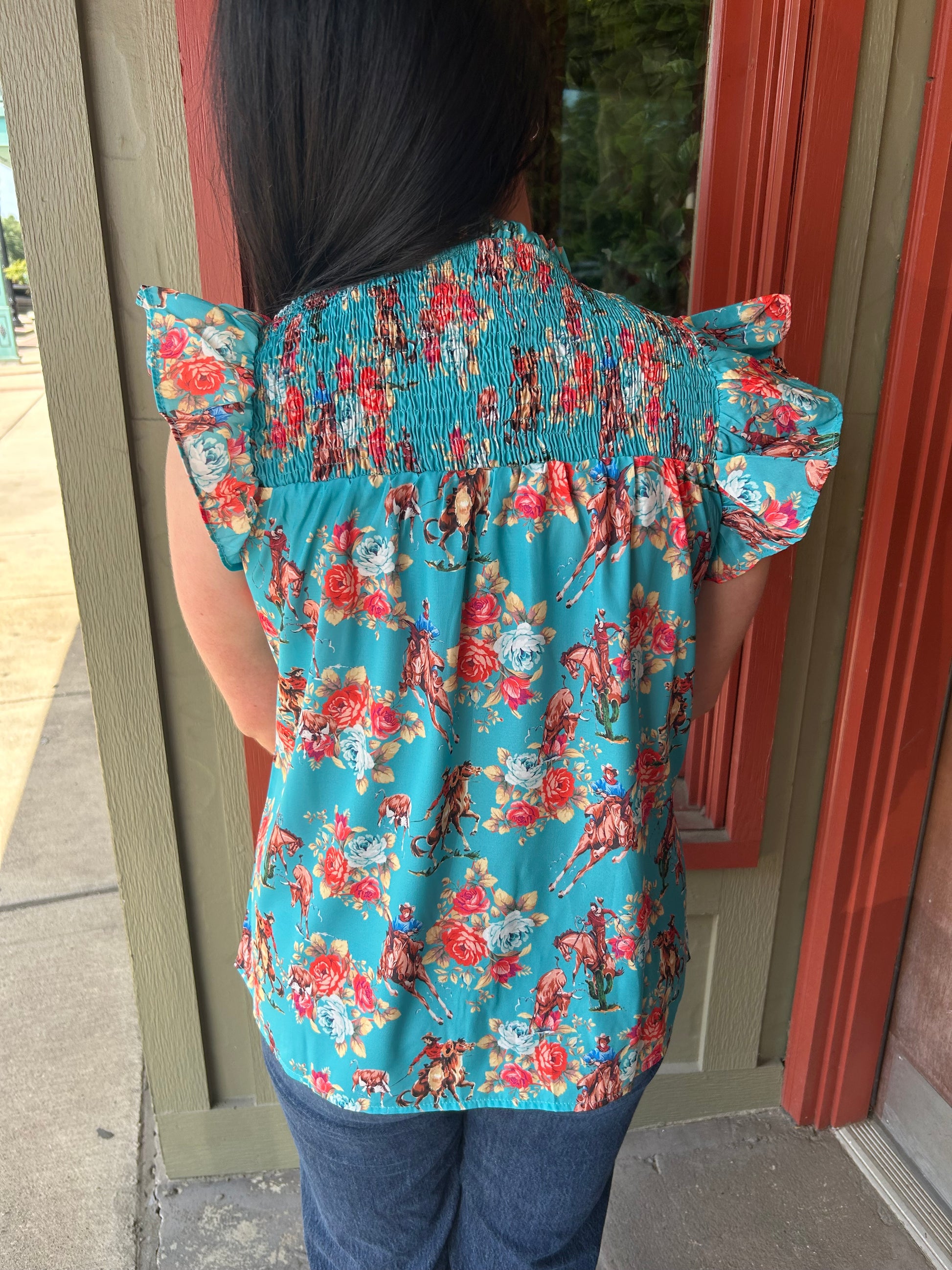 "Look no further for a cute top that will add a pop of color to your wardrobe! The Western Rose Top features a vibrant turquoise hue that will make you stand out in any crowd. With its playful tone and quirky wordplay, this top is sure to put a smile on your face (and everyone else's)!"